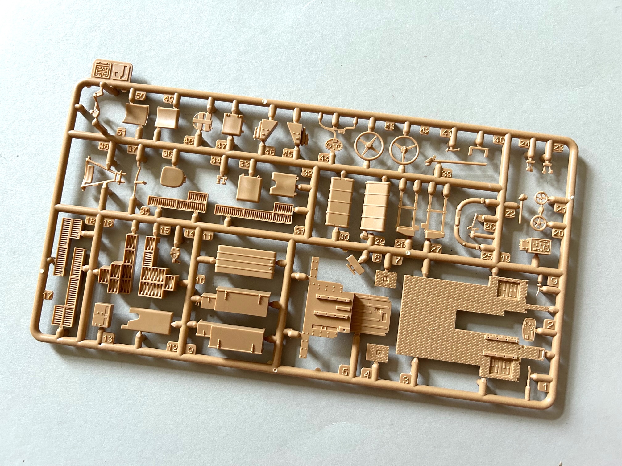 In der Packung befinden sich die beiden Gussäste I und J mit insgesamt 90 Teilen. Darüber hinaus ist noch ein Abziehbilderbogen mit Decals für das Radio und zwei für die beiden Armaturenbretter vorhanden.