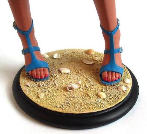 Die Base entstand wieder aus einem Holzuntersetzer, auf dem die 28 cm hohe Figur mittels zwei langen Nägeln befestigt wurde. Die Oberfläche wurde mit Leim bestrichen und Sand bestreut. Nach dem trocknen klebte ich noch einige kleine Muscheln auf den Sockel und gab ihr eine etwas größere Schnecke in die Hand. Die Stellung der Hand lud geradezu dazu ein und es passte auf Anhieb perfekt! So bekommt der Betrachter einen kleinen Eindruck von der Umgebung, in der sich Lisa gerade befindet...