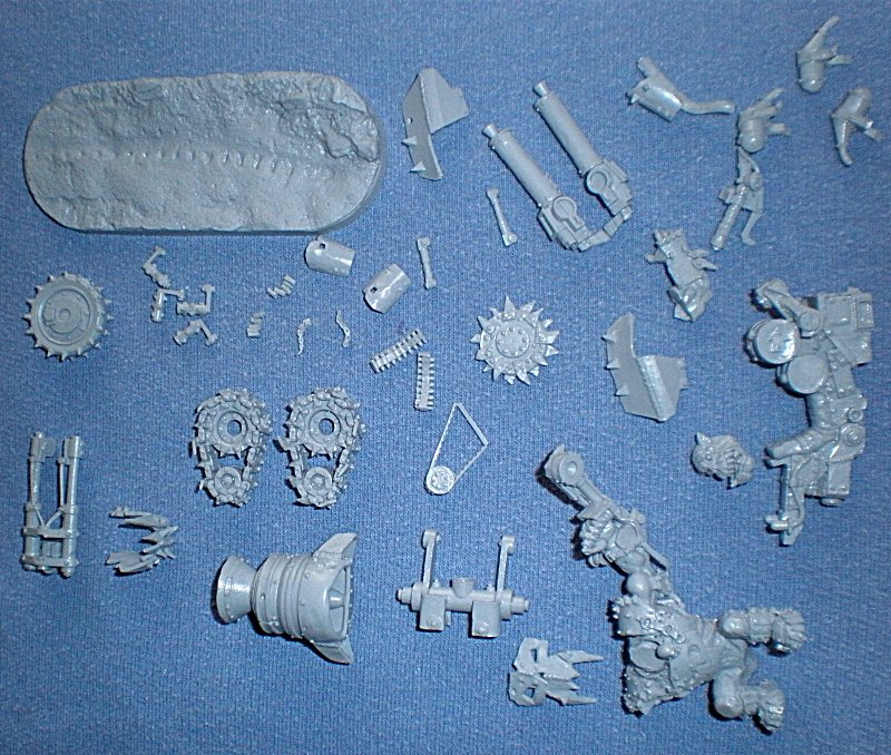 Nach knappen 4 Wochen Hoffen und Bangen hielt ich dann endlich das Modell in den Händen. Wer bei Forge World einen "echten" Bausatz erwartet wird schnell enttäuscht sein - statt eines Kartons mit schönem Deckelbild erhielt ich eine Plastik-Tüte mit 33 Einzelteilen und 2 knappen Seiten Bauanleitung die nur aus einigen s/w-Bildern besteht. Zwar vermisst man die vielen Bitz-Teile der GW-Modelle um alternaive Ausrüstungen darzustellen (z.B. einen Motor statt des Strahltriebwerkes bzw. 2 Räder anstelle der Ketten) aber irgendwie geht es auch ohne. Nach dem Bau einer vollständigen Ork-Bike-Schwadron weis man eh' wie man was und wo anzubauen hat.