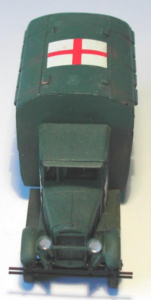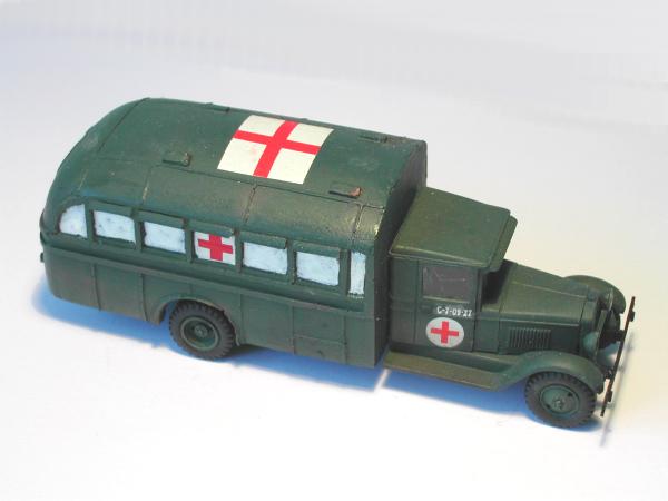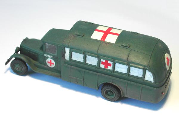 Der Bausatz aus Gießharz gehört zu den ersten Produkten von AER Modelstudio. Die Qualität ist nicht gerade berauschend, aber die Maße sind sehr gut getroffen. Vom Bausatz habe ich nur den Busaufbau verwendet, Fahrgestell usw. entstanden aus dem Spritzgussbausatz. Der Zusammenbau ist in kurzer Zeit vollzogen und das Modell steht zur Bemalung auf dem Basteltisch. Etwas Sorgen bereiteten mir die vielen "Luftlöcher" am Resinteil. Da ich zu faul war, diese alle zu verschließen, habe ich einige einfach als Beschuss- bzw. Rostschäden "deklariert". Auch Sanitätsfahrzeuge gerieten im Krieg unter feindliches Feuer und konnten Rost ansetzen.
