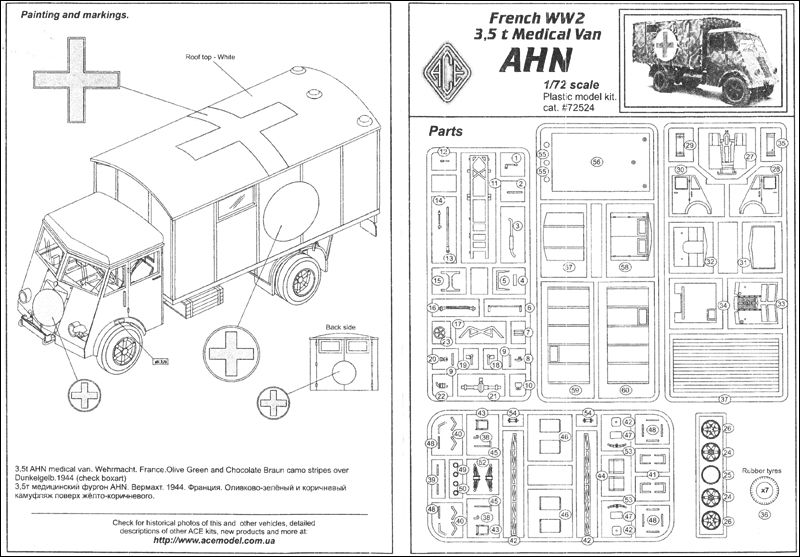 Die Spritzlinge sind in der von ACE bekannten Shortruntechnik und -qualität produziert worden. Es darf also wieder ein wenig geschnitzt, gespachtelt und geschliffen werden. Eine Verglasung muß man selbst erstellen; Zeichnungen als Vorlage sind auf der Bauanleitung vorhanden, das Klarsichtmaterial muß der eigene Vorrat an Bastelmaterial beisteuern.