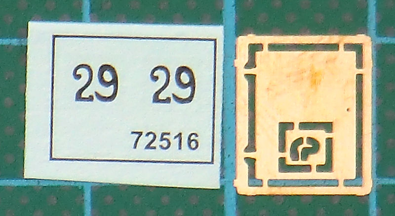 Der Decalbogen enthält nur eine kleine Nummer. Die Farbangaben sind verbal in Englisch.