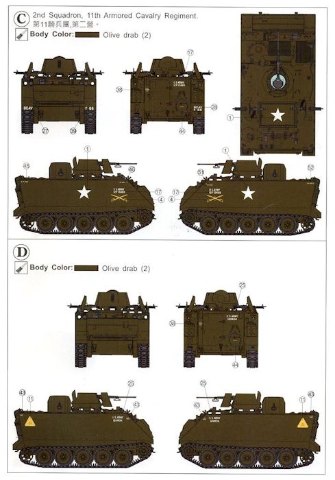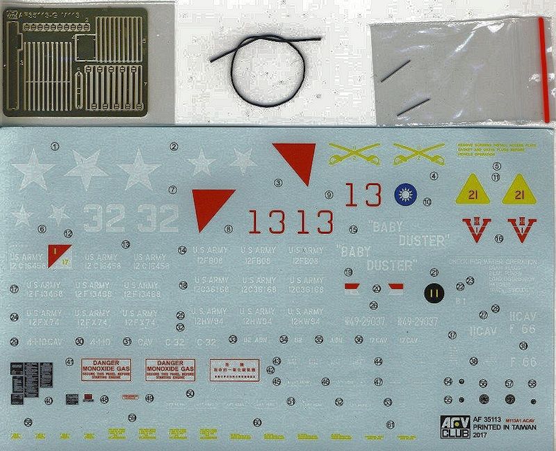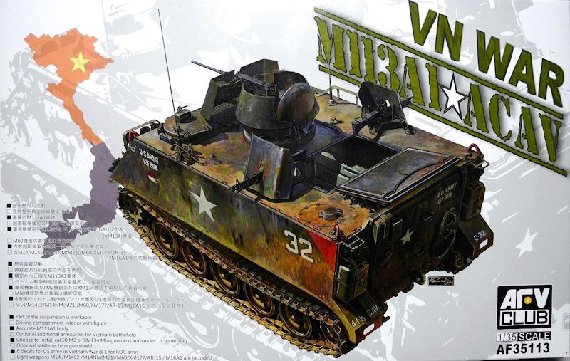 Bausatz: AFV Club erweitert seine amerikanische Fahrzeugreihe mit dem VN WAR M113A1 ACAV. Nachdem es schon diverse Modelle des M113A1 ACAV von Tamiya, Academy und Italeri gegeben hat, war man nun doch gespannt was AFV Club liefern wird. Wie nicht anders gewohnt ist der vorliegende Bausatz wieder exzellent geworden, es ist eine neue Form (keine Academy Teile) erstmalig verfügt das neue Modell über eine Drehstabfederung, Laufrollen mit separaten Bandagen und einer fast kompletten Inneneinrichtung (leider ohne Motornachbildung). Ein umfangreicher Waffensatz (inkl. XM134 Minigun und cal.50 M2), Munitionskisten, Zusatzpanzerung (Vietnam Version) sowie ein großer Decalbogen (mit sieben Einsatzvarianten) runden den neuen AFV Club Kit harmonisch ab. Die beiliegenden, einteiligen Vinylketten, werden mittels je eines Stahlstiftes verbunden. Dafür sollte man sich die ebenfalls neue bewegliche Einzelgliederkette von AFV Club gönnen.