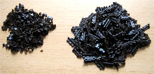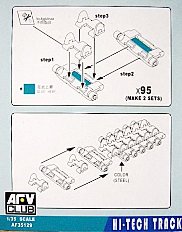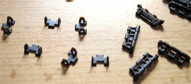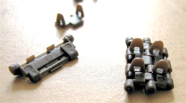 Die sehr Filigran gefertigten Einzelkettenglieder werden schon lose in zwei Beuteln geliefert. Die Beutel beinhalten zum einem das eigentliche Kettenglied und zum anderem das Element zum verbinden der einzelnen Glieder. Die aufgedruckte Bauanleitung auf der Rückseite der Verpackung lässt keine Fragen offen. Im ersten Moment war das Verbindungsteil der Kettenglieder schon etwas gewöhnungsbedürftig, es wird mit wenig Kleber auf das Kettenglied geklebt. Es muss aber sehr sorgfältig gearbeitet werden, damit die fertige Kette später auch beweglich bleibt. Einen großen Vorteil hat das Verbindungsteil, die Führungshörner der Laufrollen sind gleich angegossen und müssen nicht wie bei anderen Zubehör Kettensätzen einzeln aufgeklebt werden. Sehr gut ist der filigrane Guss der Spritzgussteile gelungen, alle Durchbrüche, auch bei den Hörnern, sind vorhanden.
