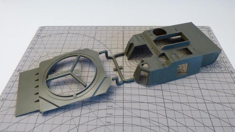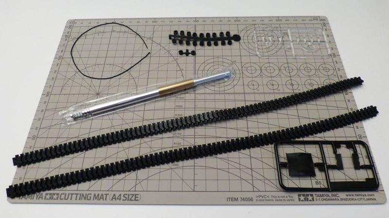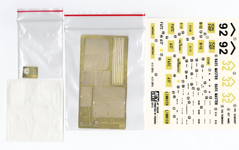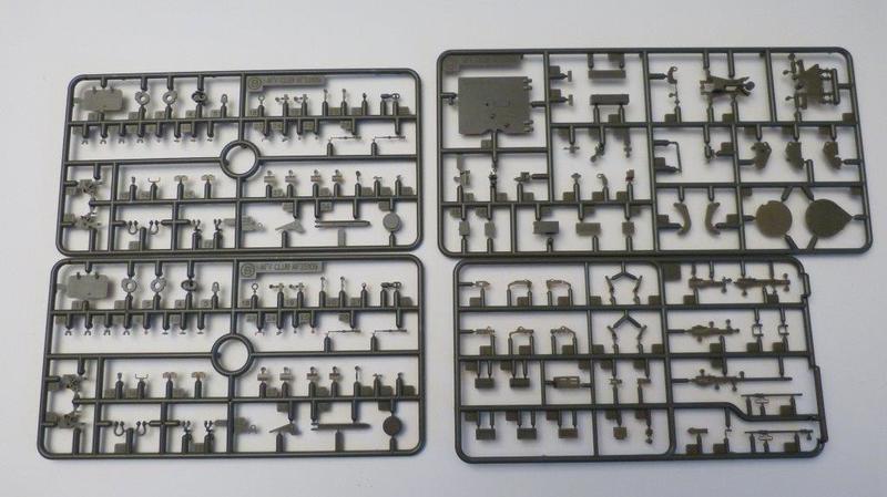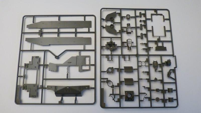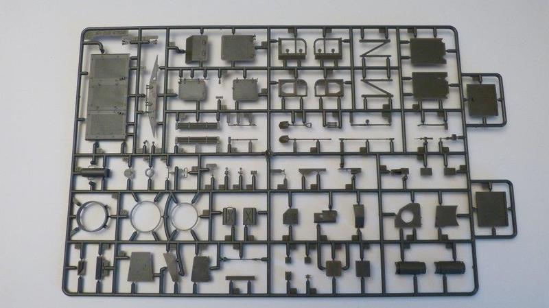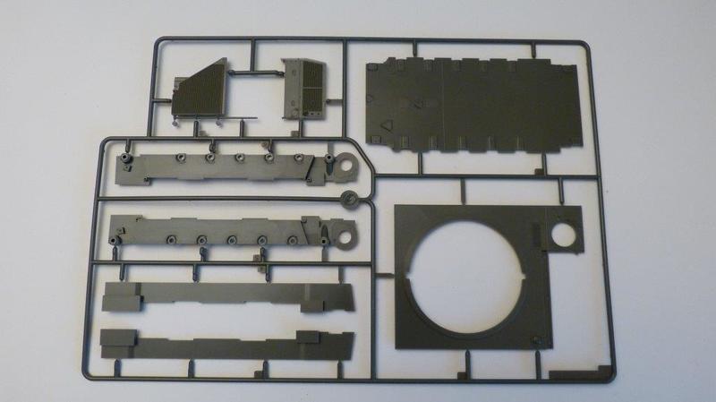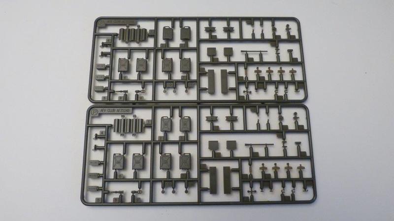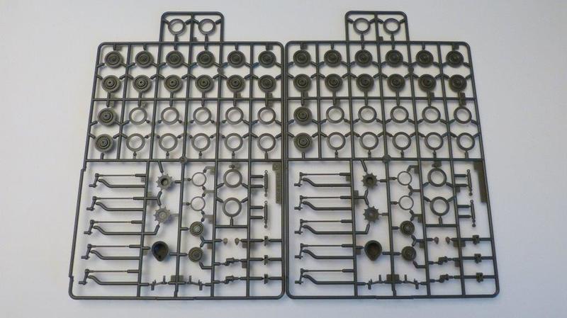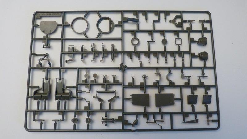Wie bei AFV CLUB gewohnt, sind die einzelnen Teile äußerst gut detailliert. Einige Bauteile sind so filigran, dass beim Heraustrennen Vorsicht geboten ist. Ein Highlight des Kits ist ein hervorragendes, gedrehtes Alurohr. Für die Wanne, die aus mehreren Teilen besteht, darf natürlich eine Drehstabfederung nicht fehlen. Zur Wiedergabe des Antirutschbelags auf der Wanne ist den Bausatz ein kleiner weißer angerauter Stickerbogen beigelegt.