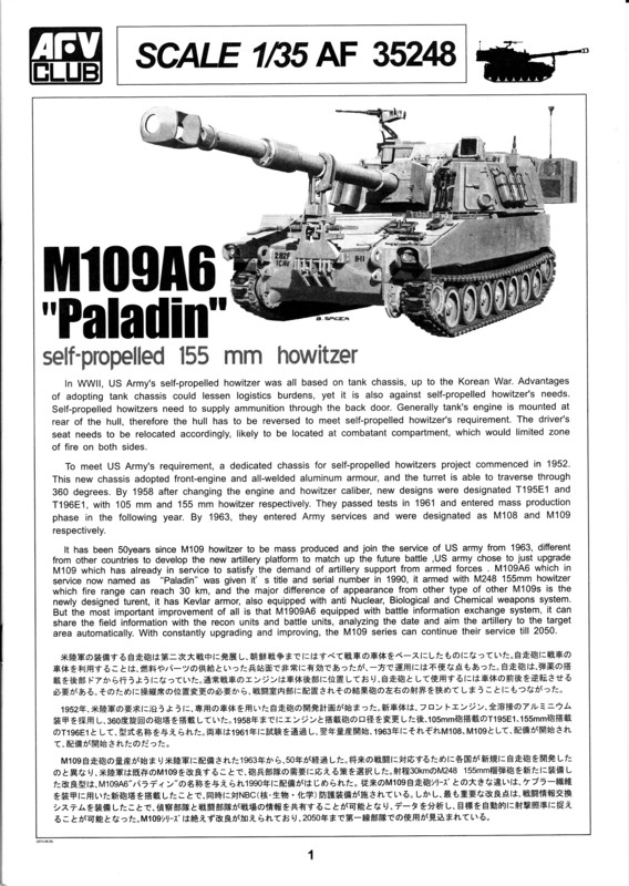 Die Bauanleitung ist leider nur in Englisch und Koreanisch ausgeführt. Aber durch die gute Wiedergabe der Zeichnungen dürften keine Probleme beim Zusammenbau auftreten. Wegen der Vielzahl der Teile sollte man schon etwas Erfahrung als Modellbauer mitbringen. Die Bauanleitung umfasst 20 Seiten und nach 34 Bauabschnitten ist man stolzer Besitzer eines Modells der M109 A6 Paladin.
