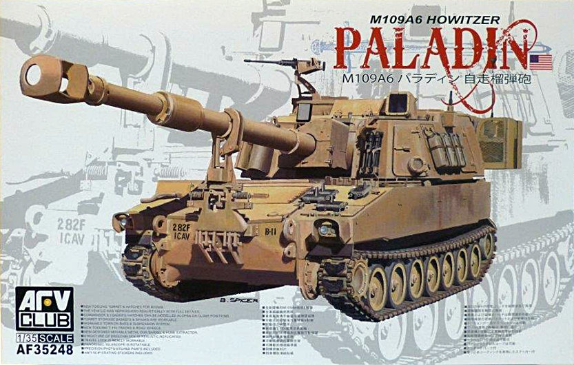 Der Bausatz: Gab es bisher nur eine M109 A6 von der Firma Italeri die im Formentausch von Revell und seit kurzem auch von Tamiya vertrieben wird, war ich erfreut zuhören, dass sich AFV CLUB der Paladin im Maßstab 1:35 annehmen wird. Nachdem Öffnen des sehr stabilen Stülpkartons mit ansprechenden Deckelbild fallen einem die Vielzahl in Dunkeloliv gespritzten Gußrahmen auf.