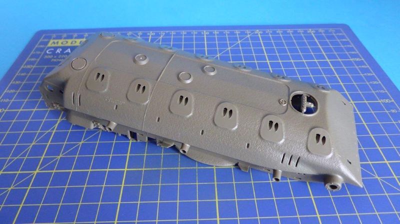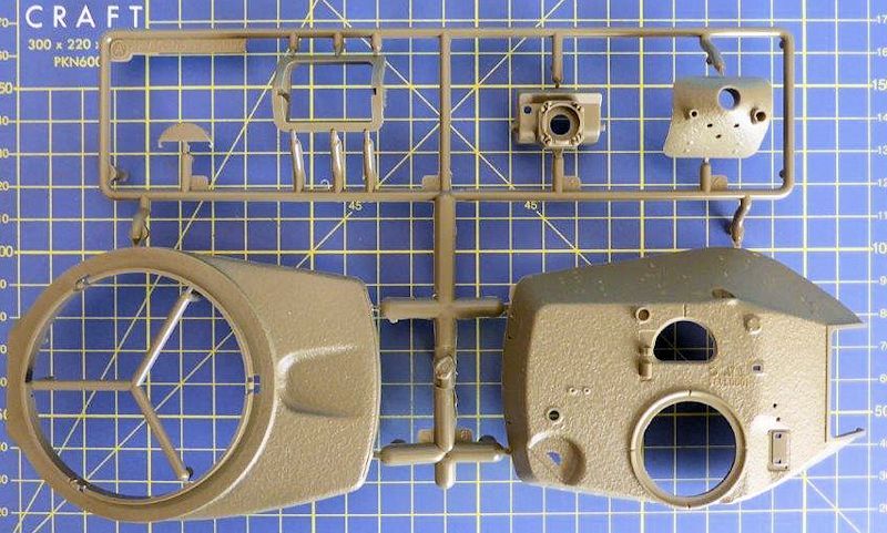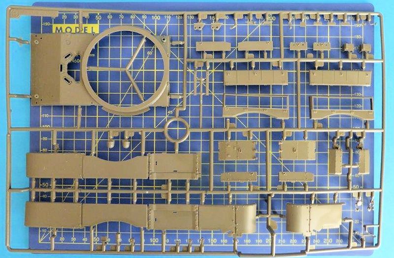 Bausatz: Der AFV Club typische stabile Stülpkarton mit attraktiven Deckelbild ist Randvoll mit olivfarbenen Spritzlingen und diversen Zusatzteilen gefüllt. Was einem als erstes ins Auge fällt ist die sehr gute herausgearbeitete Gussstruktur auf der Wanne, den Wannenoberteilen und des Turms. Alles in Allen finden sich im Karton 11 olivfarbene Spritzlinge, separat die Fahrzeugwanne, zwei Klarsichtspritzrahmen, zwei sinnvolle kleine Ätzteilplatinen unter anderen mit Gittern für den Turmkorb, die Laufkette aus Vinyl und diverse Kleinteile wie O-Ringe statt PolyCaps für die Beweglichkeit der Laufrollen, dünne Metallstreben in verschiedenen Längen, Geschützblenden aus Vinyl für die Hauptkanone und für das Kommandanten MG. Eine mitgelieferte Feder lässt die Hauptkanone ein federn. Des weiteren liegt ein Vinylkabel für den Xenon-Scheinwerfer bei. Auch das obligatorische Abschleppseil fehlt nicht. Das Oberteil der Kommandantenkuppel liegt als transparentes Teil bei. Vor der Lackierung nur die Sehschlitze mit Maskol abdecken.