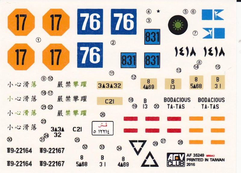 Da die Kanonenblende als Vinylteil beiliegt und dies etwas steif ist lässt sich die Hauptkanone nicht in der Höhe verstellen. AFV Club hat auf ein Alurohr verzichtet, es besteht aus mehreren Plastikteilen. Hier kann zwischen einer frühen oder späten Variante der M68A1 Kanone gewählt werden. Auch die Kommandantenkuppel ist im Innenbereich detailliert. Das MG kann beweglich eingebaut werden. Da der M60A3 auch häufig an Manövern in Deutschland beteiligt war hat AFV Club auch eine Menge Anbauteile den Bausatz beigelegt. Wie zum Beispiel einen Schusssimulator der auf dem Rohr montiert wird, einen Kampfwagenabschuss Indikator und auch der AN/VSS-3 Xenon-Scheinwerfer lassen das Herz höher schlagen. Den Tiefwaatschacht für den Auspuff hat AFV berücksichtigt, obwohl er meist nur an Fahrzeugen der US. Marines verwendet wurde.