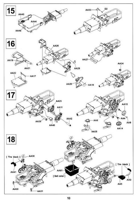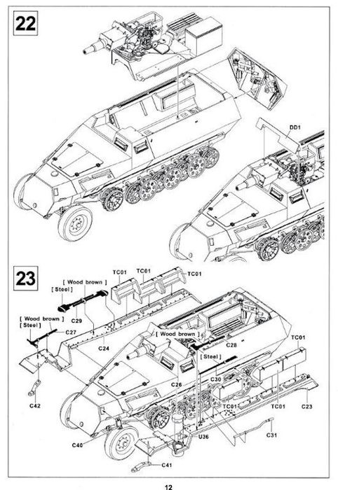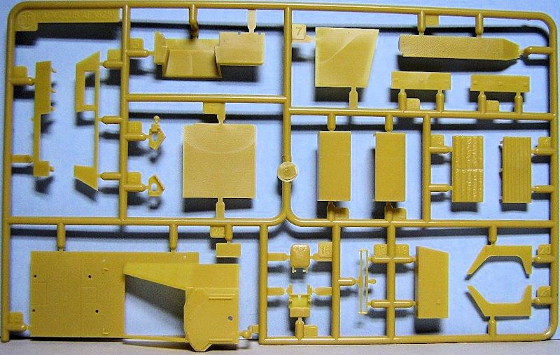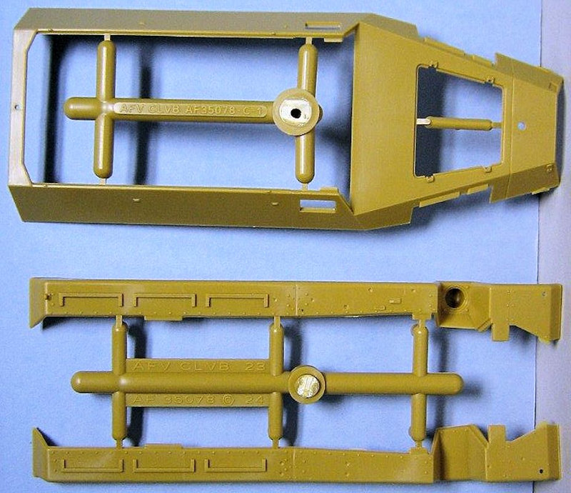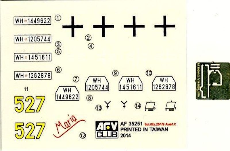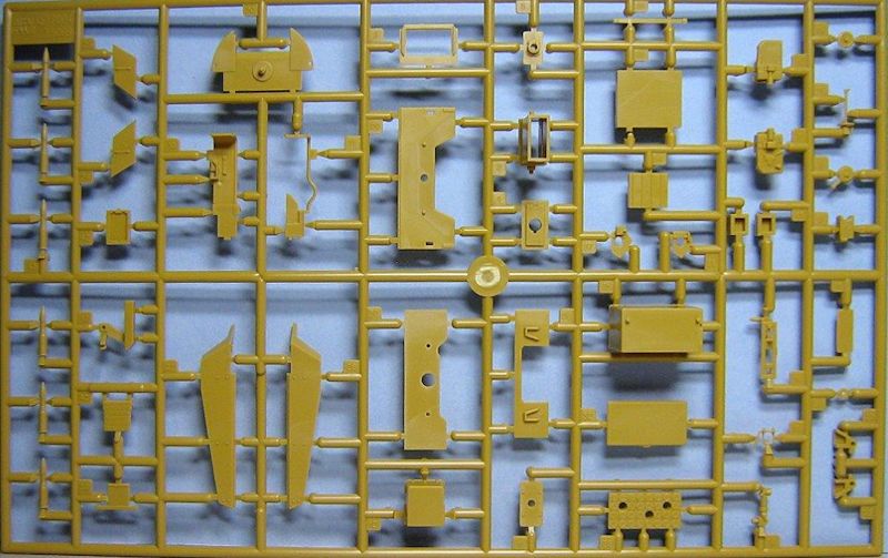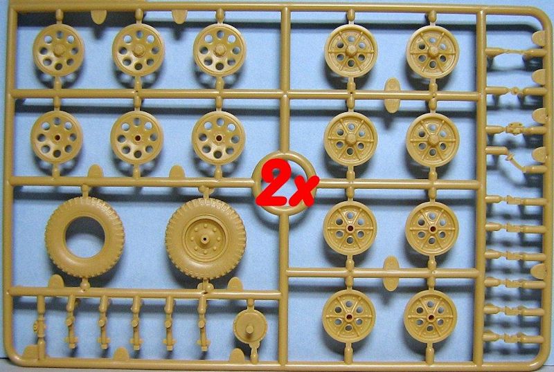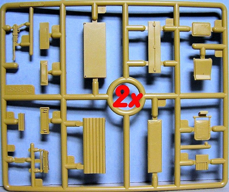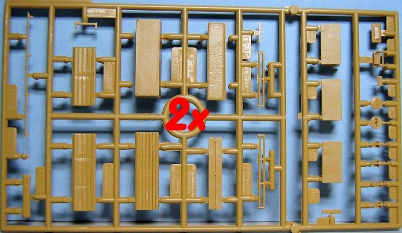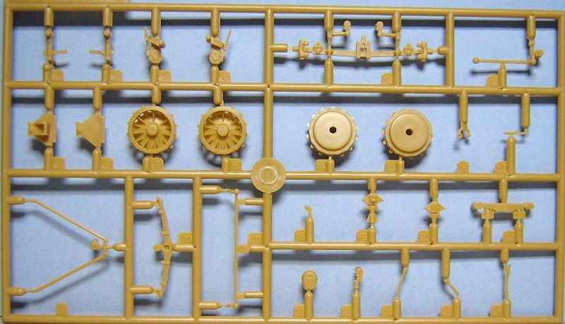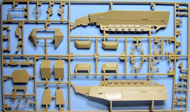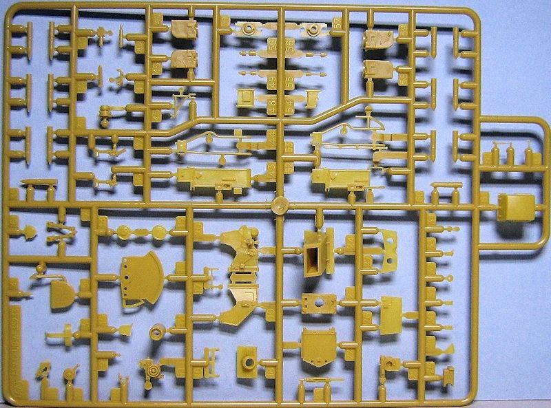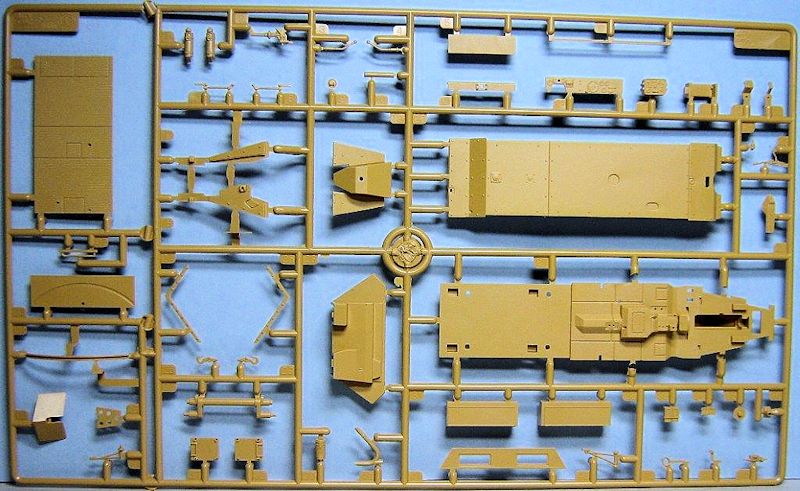 Im Karton befinden sich 14 sauber gespritzte Gießäste in beige Plastik, ein Fahrzeugoberteil und die seitlichen Kettenabdeckungen, zwei Gummiantriebsketten und einen Decalbogen. Gegenüber den schon erhältlichen Ausf.C Half-Track-Kits befinden sich zwei neue Spritzrahmen, ein in Aluminium gedrehtes Geschützrohr und ein kleiner Bogen mit Fotoätzteilen im Bausatz.
