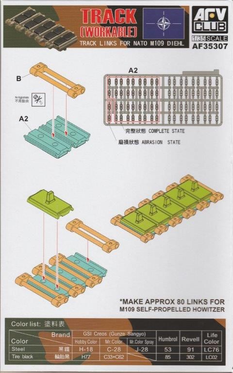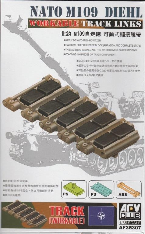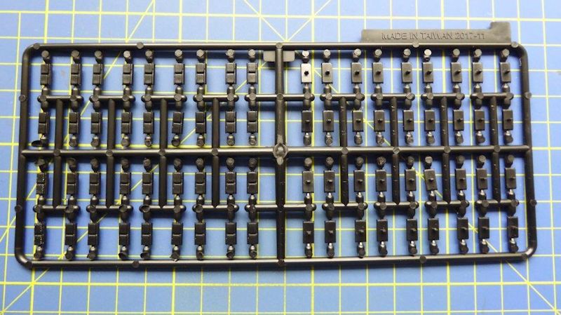 Bausatz: AFV Club aus Korea hat sich dieser neuen Kette für die M109 Haubitze angenommen. In der Faltschachtel sind Bauteile für 180 Kettenglieder enthalten. Für jedes Laufwerk werden 80 Kettenglieder benötigt. So bleibt etwas Reserve falls mal ein Missgeschick auftritt. Beim Zusammenbau empfiehlt es sich mehrere Kettensegmente zu erstellen, da Kettenbolzen und Verbinder in einem Bauteil aus der Form gekommen sind.