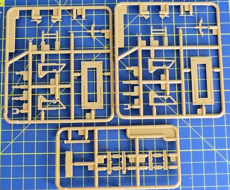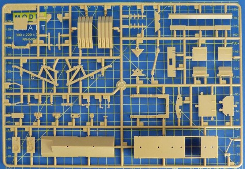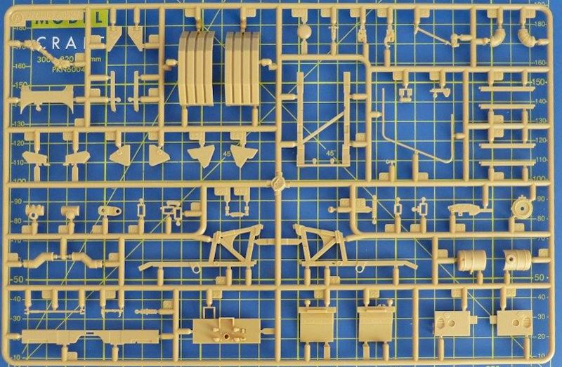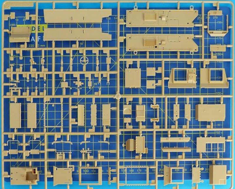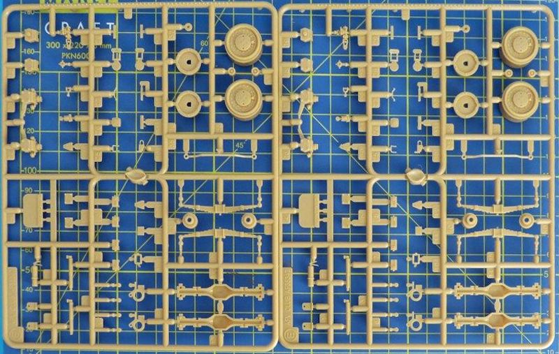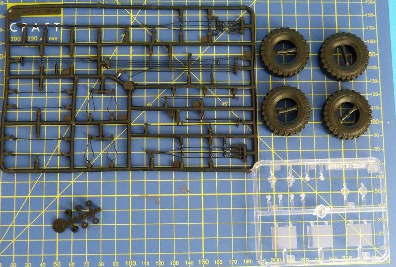 Das fängt schon mit der stabilen Verpackung an, die ein sehr gut gezeichnetes Bild des Husky ziert. Im fast randvoll gefüllten Karton befinden sich acht sandfarbene Spritzlinge und ein Gießast aus Klarsichtmaterial. Auch hier sind die Scheinwerfer und Blinker hervorragend Detailliert und mit Struktur versehen. Die Glasscheiben für die Fahrerkabine sind Klar und Schlierenfrei gegossen. Wie beim Original sollten sie aber mit grünem Klarlack lackiert werden. Hier hätte AFV Club schon etwas vorarbeiten können. Natürlich darf auch eine kleine Ätzteilplatine nicht fehlen. Weil am Chassis des Fahrzeugs eine Vielzahl von Kabeln befestigt sind, hat AFV Club diese separat dem Karton beigelegt. Zur besseren Verarbeitung sind diese aus schwarzem Vinylmaterial und an einem seperaten Spritzling dem Bausatz beigelegt.