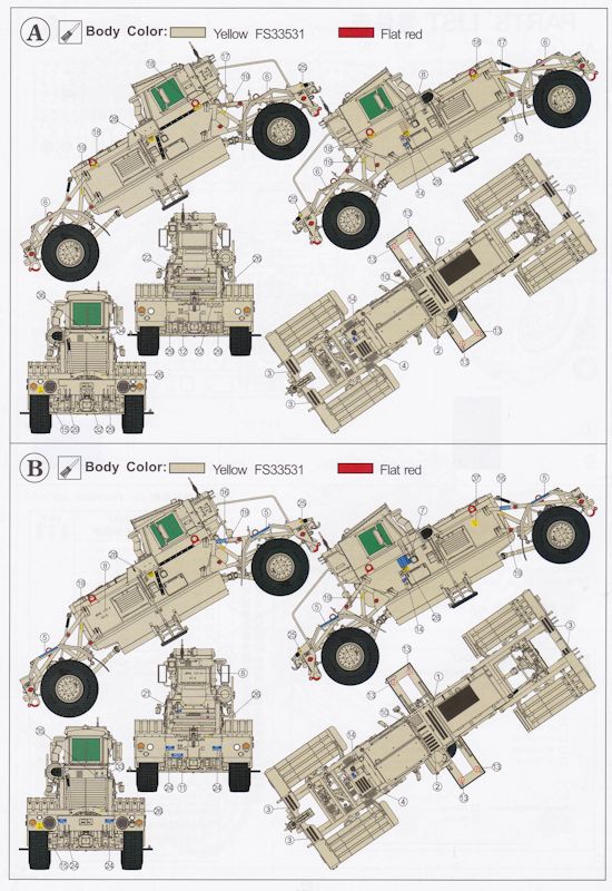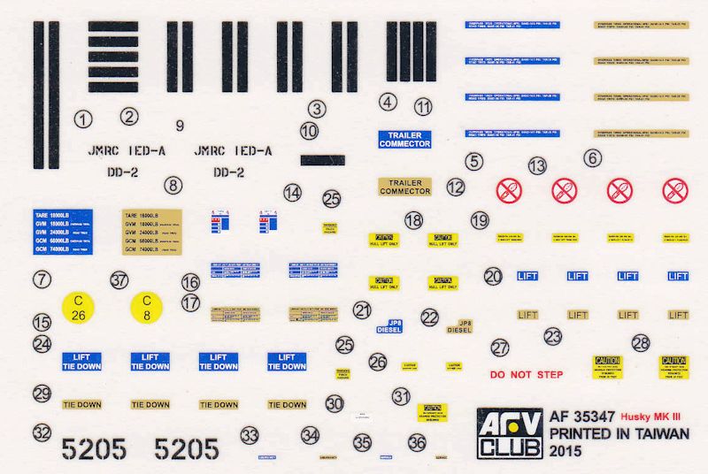 Bemalungsvarianten: AFV Club bezieht sich bei der Lackierung des Modells auf verschiedene Hersteller. Für die Lackierung des Chassis in Sandfarbe ist eine FS Nummer hinterlegt. Der gute Decalbogen erlaubt den Bau von zwei Fahrzeugen. Zur Zugehörigkeit der einzelnen Fahrzeuge innerhalb der U.S. Army gibt AFV Club leider keine Auskunft.