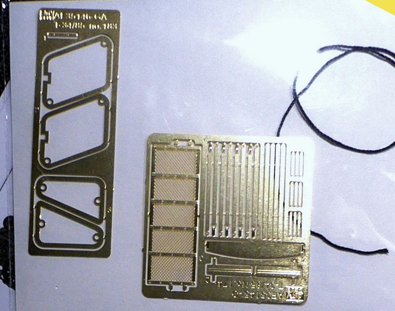 Zwei Bögen Ätzteile, ein ohne Versatz gedruckter Abziehbilderbogen, Schnurmaterial, Spiralfedern aus Metall für das Fahrwerk sowie ein gedrehtes Geschützrohr aus Aluminium vervollständigen das Ganze.