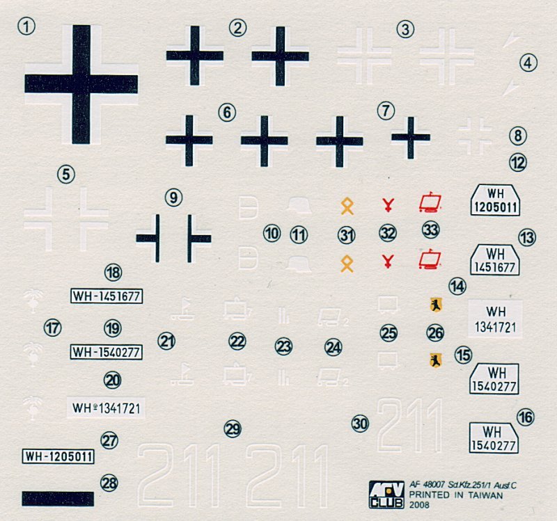 Bemalung: Der Abziehbildbogen ist recht klein (für mich als Flugzeugmodellbauer eher ungewohnt) enthält aber Markierungen für 5 Wehrmachtsfahrzeuge.