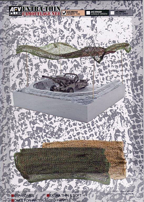 AFV Club ist neben den hervorragenden Bausätzen auch im Zubehörmarkt tätig. Das neuste Produkt ist ein extra dünnes Tarnnetz. Dieses ist so dünn, dass sogar beim betrachten Vorsicht geboten ist. Blattgold kann nicht dünner sein. Beim Anheben der Verpackung hab ich schon etwas abgehoben, was natürlich gleich zerbröselt ist. Um dieses Netz verwenden zu können, muss es erst mit einem Klarlack per Airbrush fixiert werden.