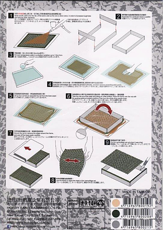 Aus der Verpackung werden aufgezeichnete Streifen ausgeschnitten und zu einem rechteckigen Kasten zusammen gefügt. Auch muss das Netz in einem flachen mit Wasser gefüllten Behälter gelegt werden. Jeder weitere Arbeitsschritt ist auf der Rückseite ausführlich erklärt. Unter der Bestellnummer AC 35019 ist es in der Farbe Wüstensand erhältlich.