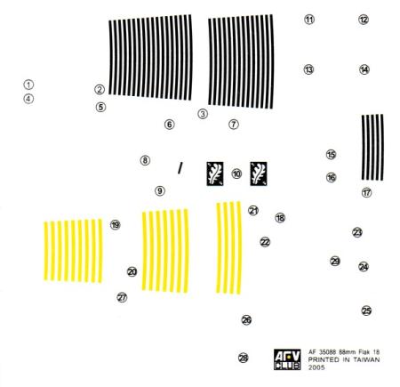 Der beiliegende Ätzteilsatz enthält hauptsächlich Teile für die realistische Darstellung der Erdsporne und Kleinteile für die Rohrwiege, Lafettenlagerung und den Abdeckungen der Vorwahlgeräte. Sämtliche Ketten für die Sicherung der Holme und der Protzen liegen in Miniaturform bei. Die Gummireifen weisen ein realistisches Profil auf, das transparente Vinylmaterial für die Kabeltrommeln (ich hatte anfangs gedacht das sei Draht!) hat einen Durchmesser von 0,6 mm und ist somit noch stimmig im Umfang (Original hätte ca. 21 mm Umfang). Es sollte entweder schwarz eingefärbt werden, oder durch dünnes schwarzes Vinylkabel ersetzt werden. Die 24-seitige Bauanleitung ist klar gegliedert. Die Farbangaben sind laut Tabelle für alle gängigen, angebotenen Farben, jederzeit anwendbar. Wie bei allen neuen AFV Club Modellen liegt ein Topf Lifecolor - German gray - dem Kit bei. Der Decalbogen enthält Markierungen für 6 Einsatzvarianten!