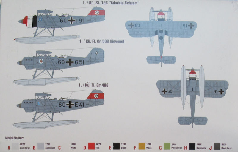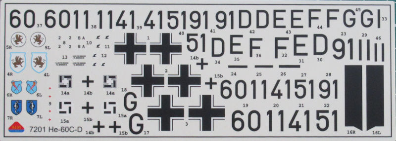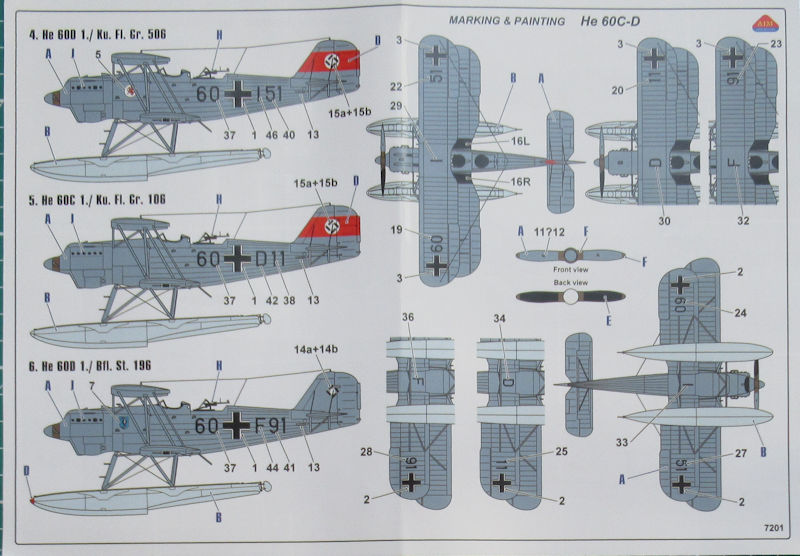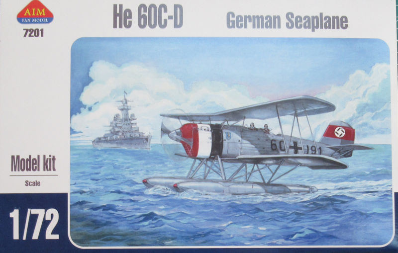 Bausatz: Die Heinkel He 60 wurde erstmals Anfang der 1990er Jahre als FLUGZEUG-Bausatz herausgebracht. Parallel erschien ein Profile Heft dazu. Später folgte noch ein Bausatz unter dem Label Azur. Kürzlich kam ein Bausatz von AIM FAN MODEL aus der Ukraine im Maßstab 1/72 heraus. In der attraktiven aber unpraktischen Schüttbox befinden sich gut verpackt sechs graue Spritzlinge mit 89 Teilen, ein klarer Spritzling mit vier Teilen, ein Decalbogen eine einfache Bauanleitung und die mehrfarbige Bemalungsanleitung.