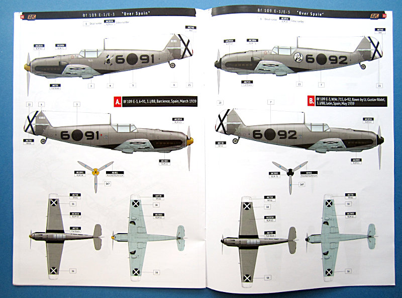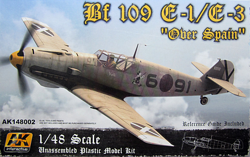 Bausatz: Zum 80. Jahrestage des Beginns des Spanischen Bürgerkriegs, haben einige Hersteller das Thema aufgegriffen und bringen passende Bausätze heraus. AK Interactive hat sich beim Formenpool von Eduard bedient, und legt die Bf 109E-1/E-3 in einer Spanienversion auf. Die Bf 109E von Eduard ist in seinen Erscheinungsformen schon häufiger bei uns vorgestellt worden, so dass ich mich hier nicht in aller Breite auslassen muss. Die Detaillierung der Oberflächen und des Innenlebens ist sehr gut. Die offen darstellbare Motorhaube, welche den Einblick in den Motorraum und auf die Rumpfwaffen ermöglicht, ist Geschmackssache und mag diesen Bausatz dem einen oder anderen verleiden. Mit der zur ersten Edition geänderten Reihenfolge des Motor-Einbaus, lässt sich das aber ganz gut handhaben. Cockpit und Fahrwerk warten mit einer Vielzahl von Details auf, welche die Modelle der 48er Bf 109E anderer Hersteller in den Schatten stellen. Das Fahrwerk scheint mir etwas lang und steil, aber daran kann man beim Bau etwas optimieren.