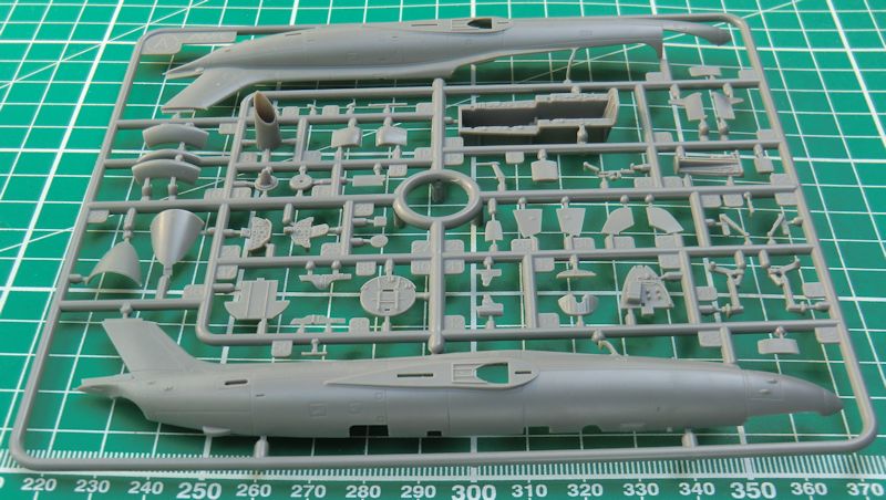 Das Fahrwerk ist gut gemacht und deren Klappen sehen filigran aus. Mir persönlich gefallen die Hauptfahrwerksschächte sehr gut. Die Luftbremsen im Heck können alternativ in geöffneter Position angeklebt werden. Zwei Zusatztanks kann man unter die Fläche "hängen". Die Kanzel kann in geöffneter oder geschlossener Position angeklebt werden.