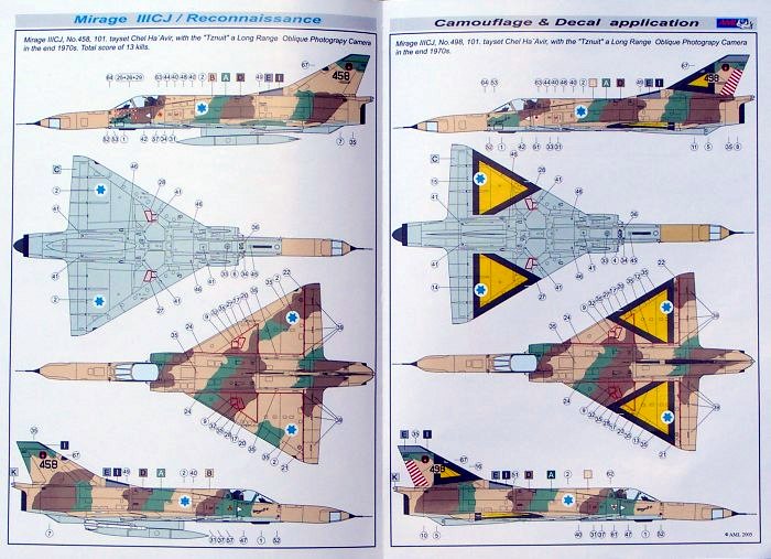 Bei der Nase gibt es vier Möglichkeiten zur Auswahl: 1. normale Mirage IIICJ, 2. TARMIL-Aufklärernase, 3. TZNUIT-Aufklärernase und 4. die lange TZNUIT-Aufklärernase. Nicht für jede Option ist eine Decalvariante vorhanden! Der bündig an der Rumpfunterseite angebrachte Tank ist in der Form nicht korrekt und sollte entsprechend Zeichnungen verändert werden. Wenn man hat, dann kann man auch die alte Heller Mirage III schlachten. Ansonsten kann nach Bauanleitung verfahren werden. Schön ist die Bemalungsanleitung, die sehr gute farbige Vierseiten-Ansichten und umfangreiche Farbangaben zu verschiedene Herstellercodes enthält. Der Decalbogen ist sehr umfangreich und enthält auch umfangreiche Wartungshinweise.