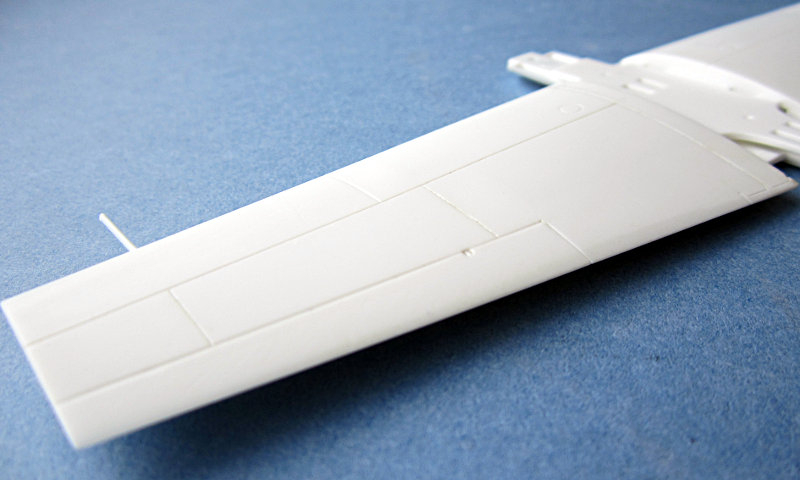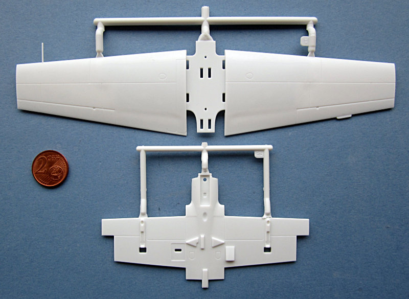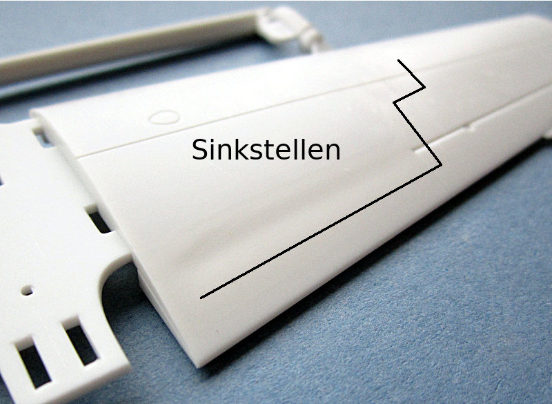 Die Oberflächendetaillierung ist sehr einfach. Die Blechstöße sind durch wenige tiefe und recht breite Gravuren dargestellt. Die am Original recht prominenten erhabenen Nietenreihen fehlen. Das Material ist recht dick aber gut zu bearbeiten. Beides sowie die tiefe Gravur kommen dem Modellbauer beim Abschleifen des Kits zugute. Der Flügel hat auf der Oberseite rund um die unterseitige Aussparung sehr deutliche aber zum Glück nicht allzu tiefe Sinkstellen. Mit einer guten Halben Stunde Schleifarbeit (für Ober- und Unterseite) kann man diese beseitigen und sorgt gleichzeitig noch für etwas schärfere und flachere Gravuren. Ich habe diese auch ein zwei mal mit einer Nadel nachgezogen. Für eine vollständig weiße Lackierung wird man diesen Schritt nicht umgehen können. Beim Rumpf sieht es ähnlich aus. Hier zieht sich eine seltsame Delle über die ganze Länge. Ich hab mich da noch nicht ’rangetraut, da ich die Rumpfform auch nicht zerstören will. Den viel zu kastigen Rumpf möchte ich gern "Bernd, dem Brot" überlassen…