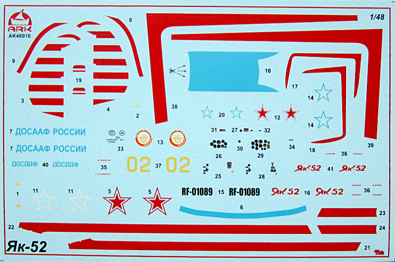 Gerade von der zweiten Maschine kann man über das www sehr leicht Fotos finden. Das Blau erscheint mir deutlich zu hellblau, sowohl für den Blendschutz, als auch für den DOSAAF Schriftzug und die Hoheitszeichen mit rot-weiß-blauem Stern. Weiterhin ist zu beachten dass hier der Streifen auf der Tragfläche bis einschließlich des Übergangsblechs rot ist. Je nach Vorbild ist auf der Unterseite die Tragfläche genauso weit rot zu lackieren, wie der Streifen auf der Oberseite. Die Mitte bleibt "weiß" (Abgasfahnen). Auf dem Zubehörmarkt sind mir bisher keine umfangreicheren Decalsätze für die Jak-52 begegnet (von HAD gibt es eine ungarische (48167) und von Linden Hill eine armenische (LHD48017)).