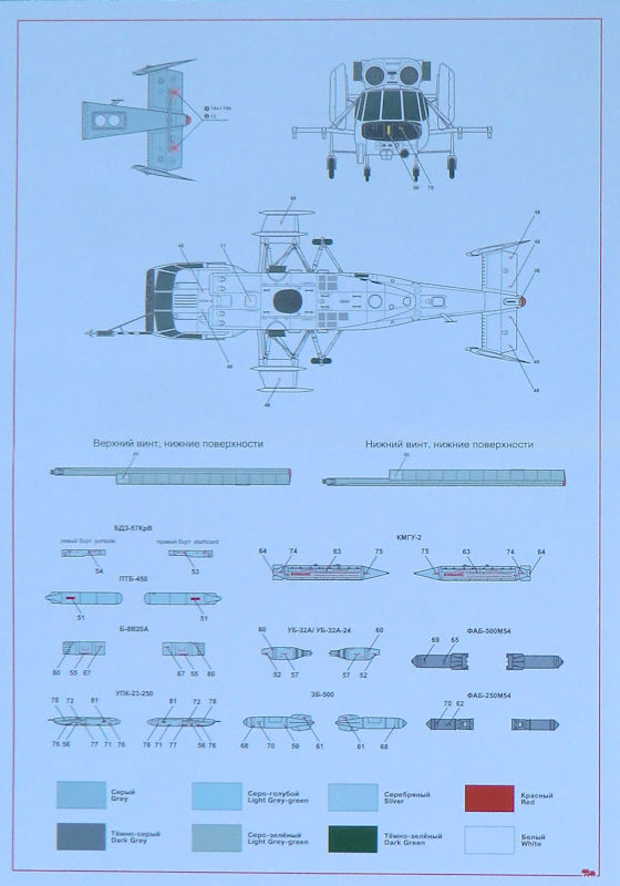 Bei den Außenlasten hat ARK models/HobbyBoss richtig geklotzt. Hier gibt es wohl alles was man an einem Ka-29 befestigen kann. Zwar gibt es auch einen Plan zur Befestigung dieser Außenlasten, jedoch ist der nicht besonders aussagekräftig für mich.