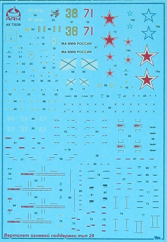 Der Decalbogen ist ohne Versatz auf hellblauem Trägerpapier gedruckt. Er enthält auch eine Menge Wartungshinweise. Abziehbilder für die Instrumentenbords sucht man allerdings auch bei ARK models vergeblich. Informationen über die gewählten Vorbilder der Bemalungsoptionen gibt es leider nicht.