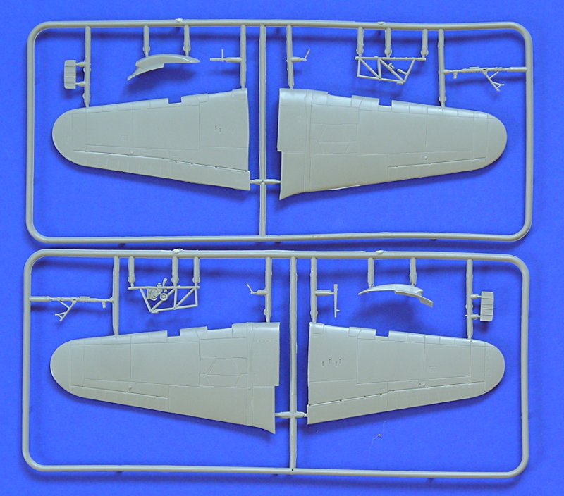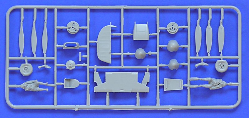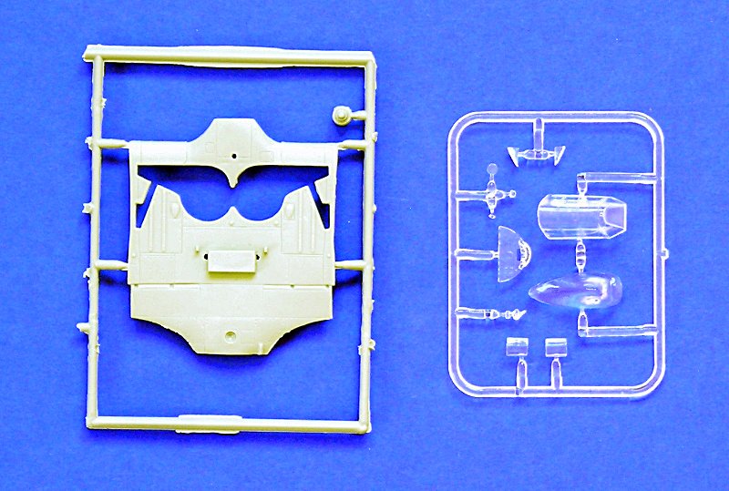 Insgesamt wirkt der Bausatz sehr "russisch" und ist definitiv in den Bereich "short run" einzuordnen. Die Gravuren sind ziemlich breit und tief. Sinkstellen und Verzug der Bauteile findet sich an jedem Spritzling. Dazu gib es noch jede Menge "flash" bzw. Gußgrate. Die "Klarteile" in meinem Exemplar sind unbrauchbar und zwingend zu ersetzen. Die Stoffstruktur am Rumf wirkt hingegen recht gut und vergleichsweise dezent.