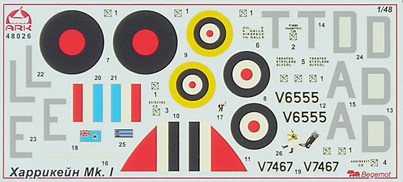 Die Abziehbilder sind von Begemot und sehen ganz ordentlich aus. Einziges Manko ist der Farbfehler bei den Decals für die Ruderfinne und die Flagge Burmas für die Maschine von Robert Stanford-Tuck. Wie schon erwähnt fehlen bei mir jegliche Hinweise zur Bemalung.