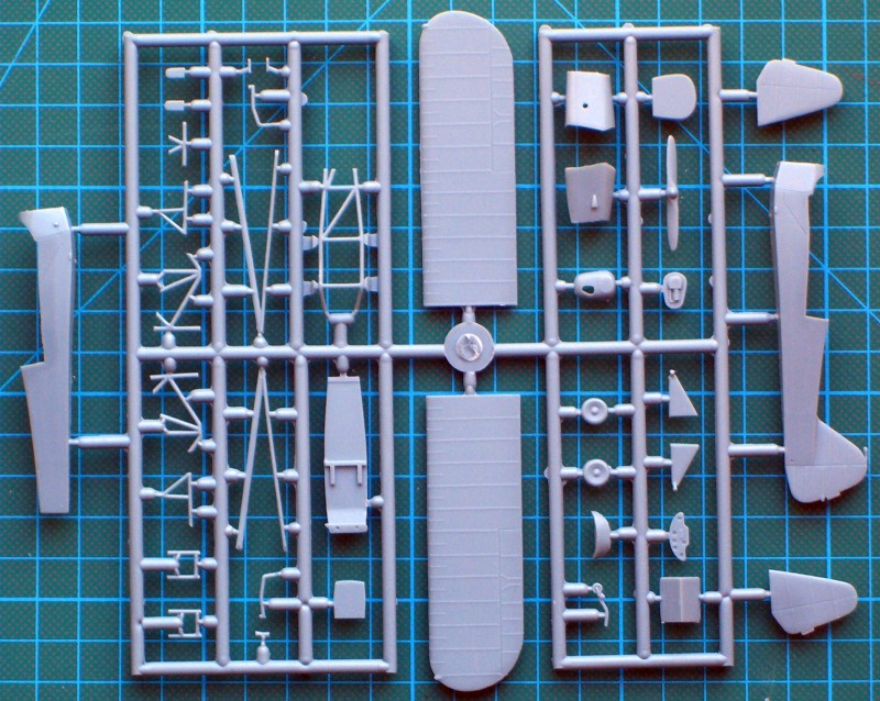 Das Cockpit besitzt eine solide Detaillierung. Der dritte Sitz aus Resin hat aufmodellierte Sitzgurte. Die doppelsitzige Bank hat keine Gurte. Diese müssen in Eigenregie nachgerüstet werden. Das Rumpfgerüst wird vor der Motage der Kabinenhaube zusammengebaut und die Haube wird danach draufgesetzt. Die Tragflächen werden stumpf an die Kabinenhaube angeklebt. Zum Ausrichten sind die Streben unbedingt notwendig. Etwas komplizierter ist der Anbau der Landeklappen bei dieser Version. Die Bauanleitung hilft hier aber weiter.