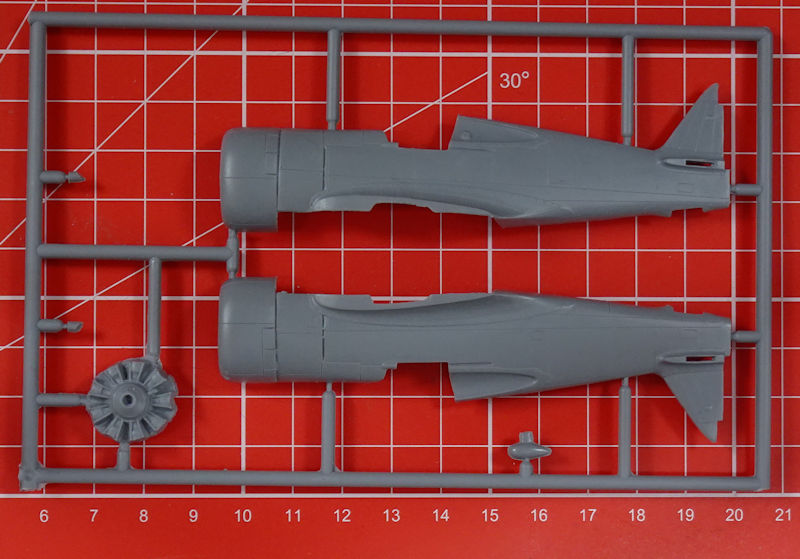 Der Bau beginnt mit dem Cockpit. Das Instrumentenbrett bekommt ein Decal und auch für die Sitzgurte nutzt AZmodel diese. Als R-1820 gibt es ein Motorrelief. Die Rumpfinnenseiten besitzen sehr schöne Strukturen und vor dem Zusammenbau der beiden Rumpfhälften muss das Spornrad samt Fahrwerksbein eingeklebt werden. Aus drei Teilen wird die Tragfläche zusammengesetzt. Zuvor müssen noch die beiden Hauptfahrwerksschächte eingeklebt werden. Die Querruder besitzen, wie die anderen Ruder auch, scharfe Hinterkanten. Der Modellbauer muss die vier Flächen-MGs selbst aus passenden Material anfertigen.