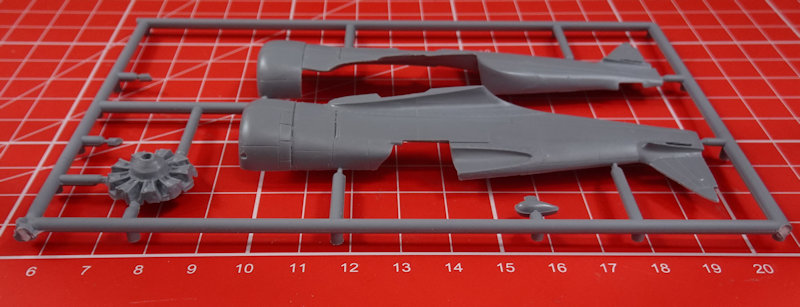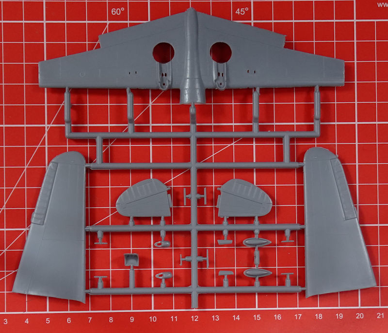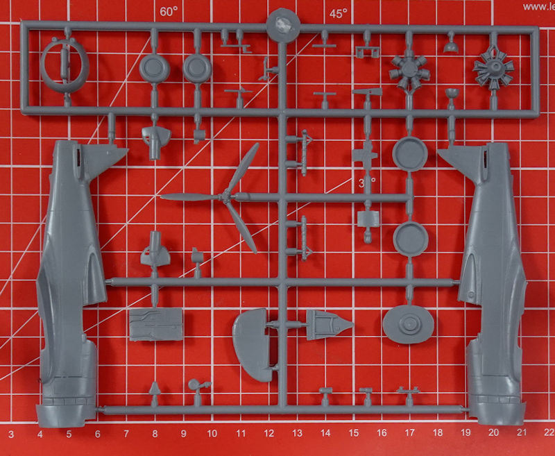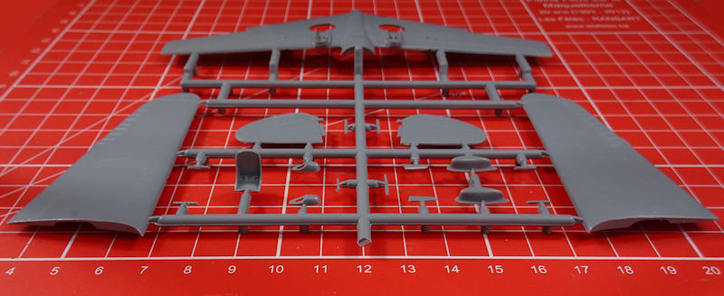 In der attraktiven aber unpraktischen Schüttbox befinden sich gut verpackt drei hellgraue Spritzlinge mit 61 Teilen, ein klarer Spritzling mit vier Teilen, ein Decalbogen und die mehrfarbige Bauanleitung. Einige Teile sind für die Hawk 75A-1 bis A-3 bestimmt und wandern in die Restekiste. Es gibt feine versenkte Strukturen aber man findet auch etwas Grat.