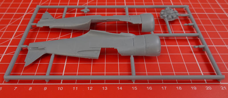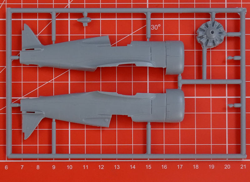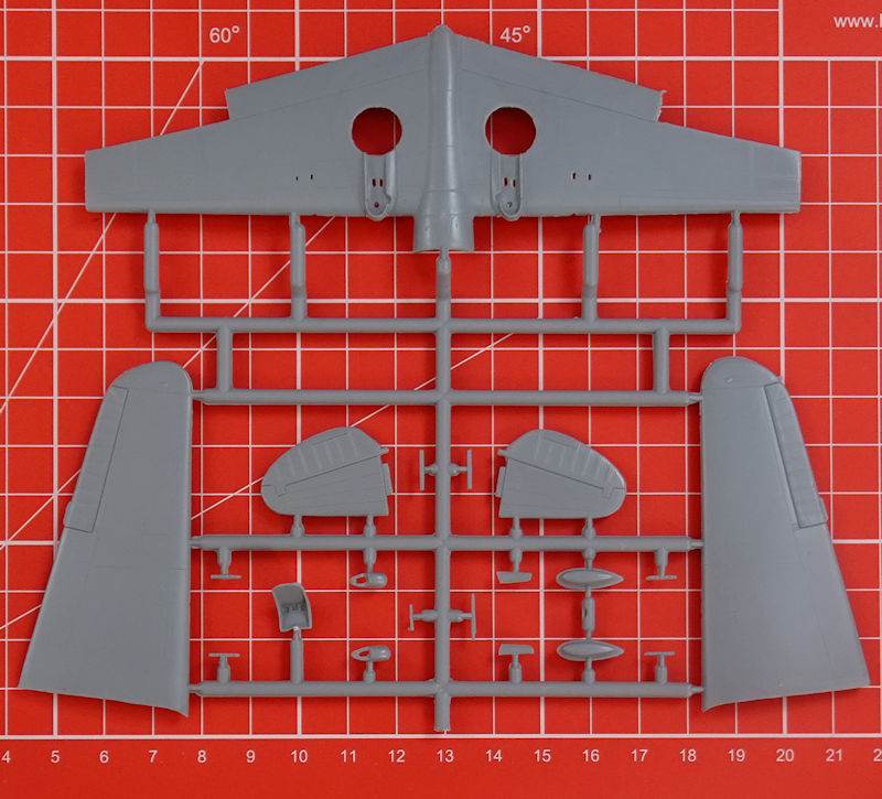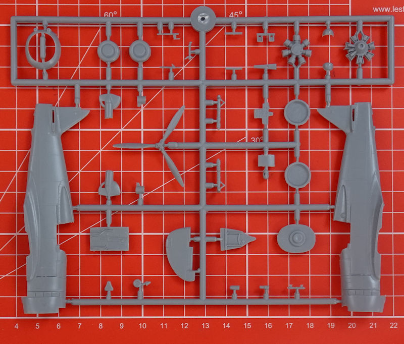 In der attraktiven aber unpraktischen Schüttbox befinden sich gut verpackt drei hellgraue Spritzlinge mit 61 Teilen, ein klarer Spritzling mit vier Teilen, ein Decalbogen und die mehrfarbige Bauanleitung. Einige Teile sind für die Hawk 75A-1 bis A-3 bestimmt und wandern in die Restekiste. Es gibt feine versenkte Strukturen aber man findet auch etwas Grat.