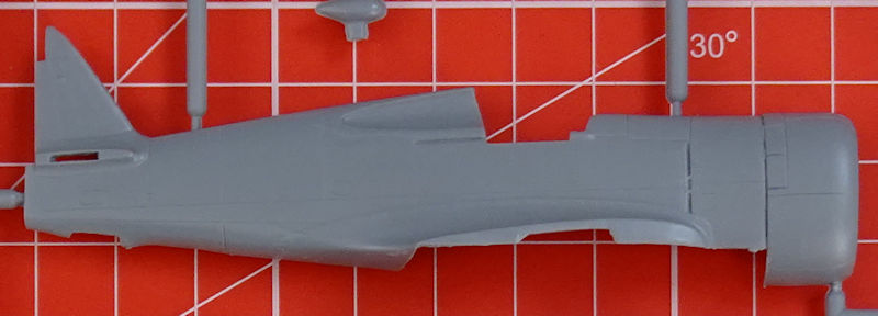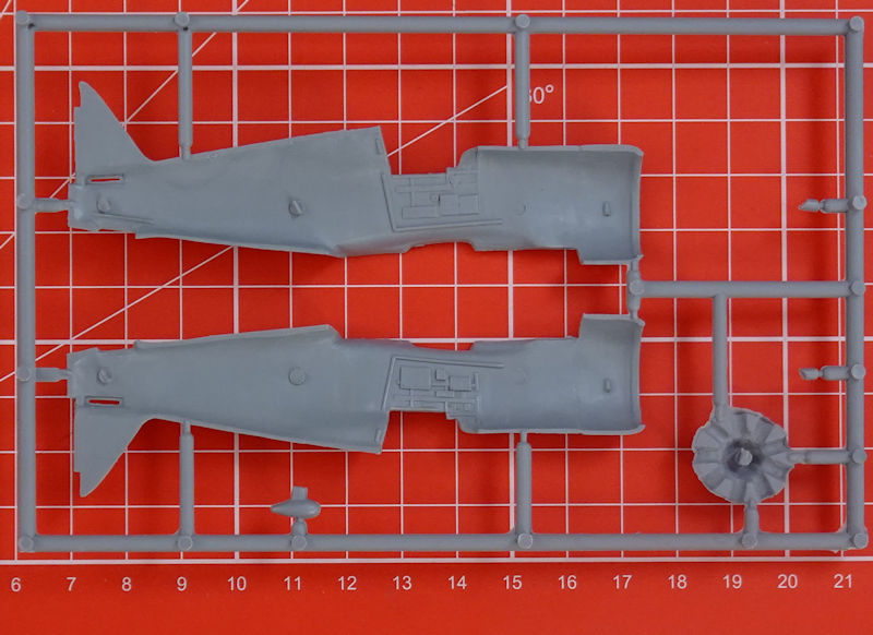 Der Bau beginnt mit dem Cockpit. Das Instrumentenbrett bekommt ein Decal und auch für die Sitzgurte nutzt AZmodel diese. Als R-1820 gibt es ein Motorrelief. Die Rumpfinnenseiten besitzen sehr schöne Strukturen und vor dem Zusammenbau der beiden Rumpfhälften muss das Spornrad samt Fahrwerksbein eingeklebt werden. Aus drei Teilen wird die Tragfläche zusammengesetzt. Zuvor müssen noch die beiden Hauptfahrwerksschächte eingeklebt werden. Die Querruder besitzen, wie die anderen Ruder auch, scharfe Hinterkanten. Der Modellbauer muss die vier Flächen-MGs selbst aus passenden Material anfertigen.