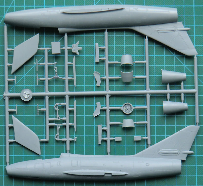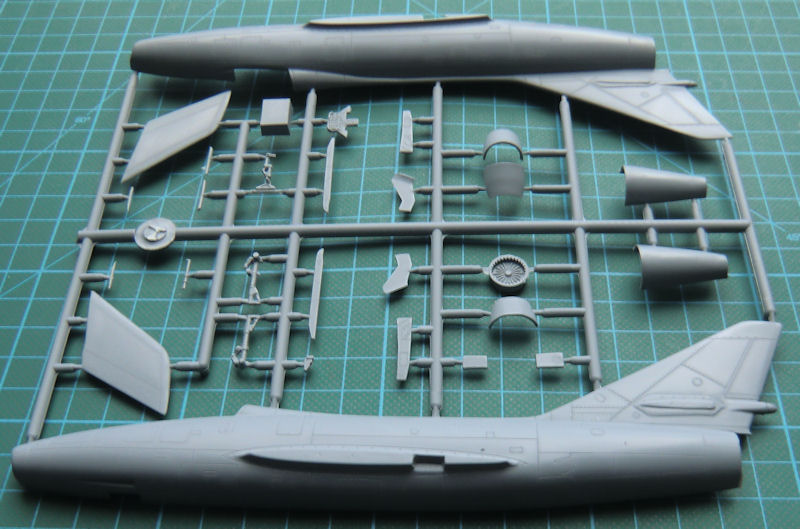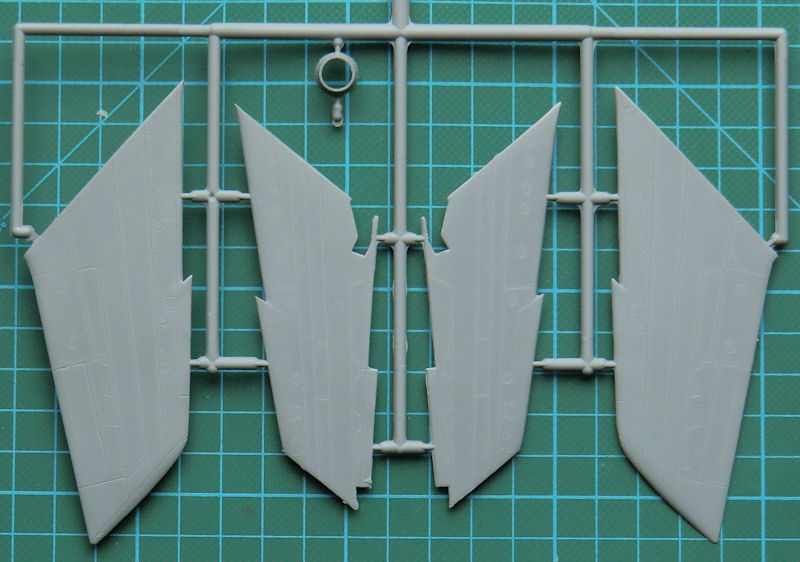 Das Cockpit besteht aus einer Resinwanne mit anmodellierten Steuerknüppel, einem schönen Resinschleudersitz und dem Instrumentenbrett. Beim Einbau des Triebwerksauslasses müssen auch die richtigen Teile für den P&W-Antrieb verbaut werden. Die Tragflächenhälften besitzen scharfe Hinterkanten, denn diese sind an die Oberseite anmodelliert. Schön sind auch die beiden einteiligen Höhenleitwerkshälften.