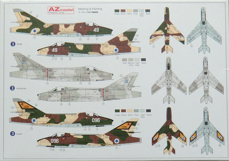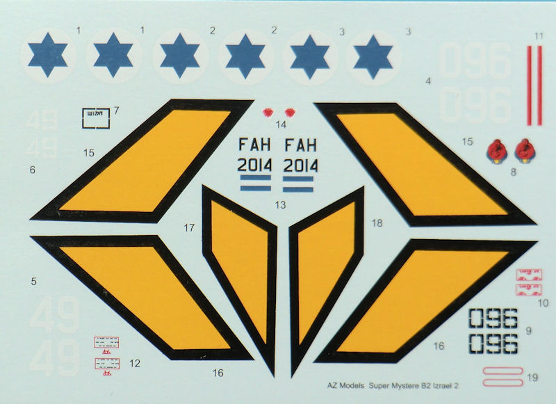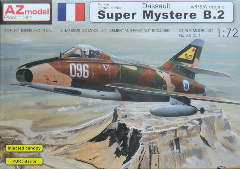 Bausatz: Eine zeitgemäße Super Mystere war schon lange überfällig. So hat sich AZmodel mal dieses Vorbilds angenommen. Insgesamt gibt es drei verschiedene Bausätze, die sich allerdingt nur durch den Karton und Decals unterscheiden. In der typischen attraktiven aber unpraktischen Schüttbox befinden sich gut verpackt zwei hellgraue Spritzlinge mit 33 Teilen, eine einteilige Spritzgusskanzel, fünf Resinteile, ein Decalbogen und die Bauanleitung. Letztere enthält leider keinerlei Informationen zum Vorbild. Die Spritzgussteile besitzen feinste Details. Auf einem Tragflächenteil sind bei meinem Bausatz allerdings ein paar kleinste Sinkstellen.