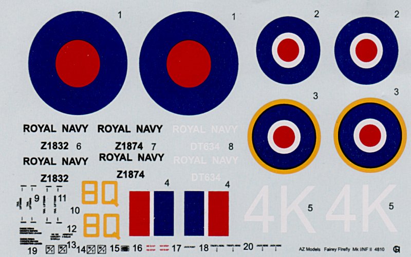 AZ hat drei Bemalungsvarianten vorgesehen, die farbig dargestellt sind. Die Markierungen dafür finden auf einem kleinen Bogen Platz. Die Decals sind anscheinend ohne Versatz gedruckt, ein Hinweis auf den Hersteller fehlt. Schön sind die beiliegenden Masken von Eduard. Der kleine, ebenfalls von Eduard stammende, Ätzteilbogen ist nicht farbig bedruckt und es liegt ein Reprofilm für die Skalen der Instrumente bei.