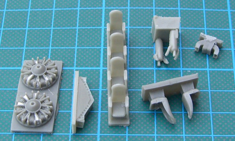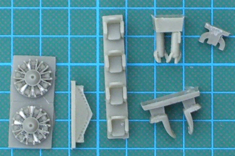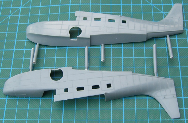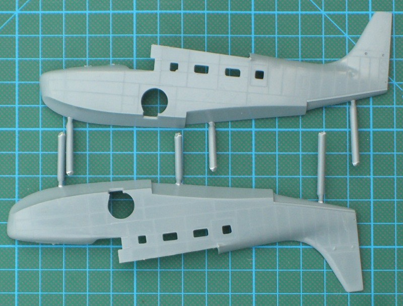Für die britische Version gibt es auch die großen Bilster. Entgegen der Bauanleitung besteht die Cockpitverglasung aus zwei Teilen. Der Bausatz enthält die Zweiblatt-Luftschrauben wie sie bei den gewählten Vorbildern eingebaut wurden. Die britischen JRF-6B flogen scheinbar ohne die mitgelieferten Spinner.