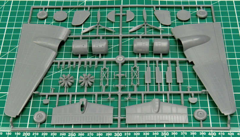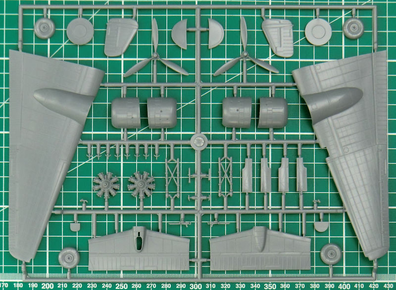 Das Fahrwerk ist recht ordentlich detailliert aber die Klappen dafür haben innen keine Struktur. Die beiden Propeller bestehen je aus einem Stück und bekommen noch ein Paar Spinner aufgeklebt.