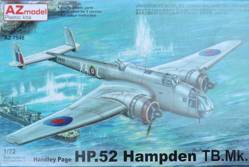 Bausatz: AZmodel hat hier mit der HP Hampden im Maßstab 1/72 keine neue Form erstellt, sondern man nutzt den Valom-Bausatz von 2008. Diesen bietet man auch etwas preiswerter an aber er ist nicht vollständig identisch. In der attraktiven aber unpraktischen Schüttbox befinden sich gut verpackt zwei graue Spritzgussrahmen mit 85 Einzelteilen, ein klarer Rahmen mit zwölf Teilen, ein Fotofilm, ein Decalbogen und die mehrfarbige Bau- und Bemalungsanleitung.