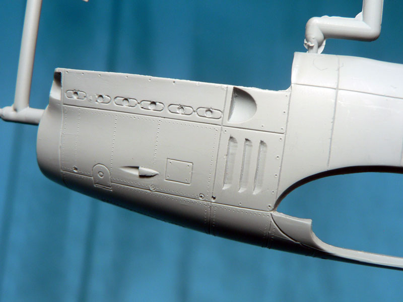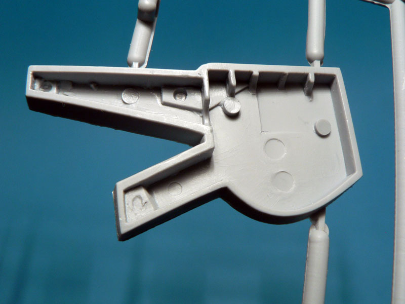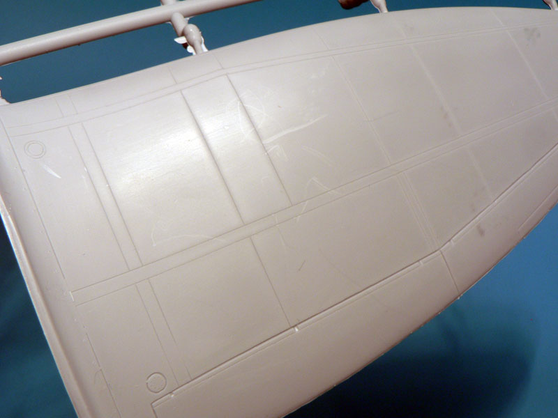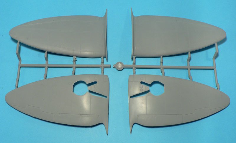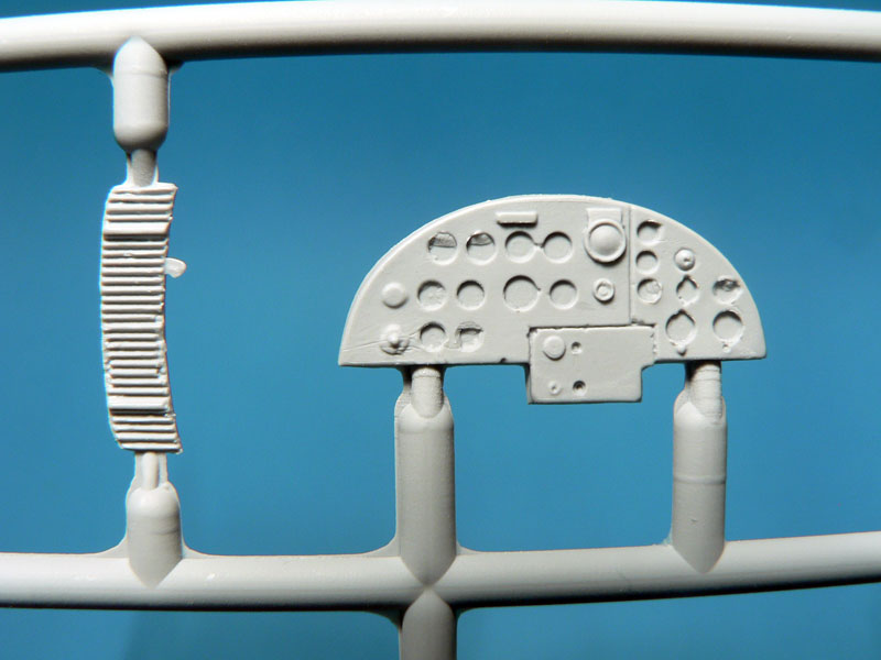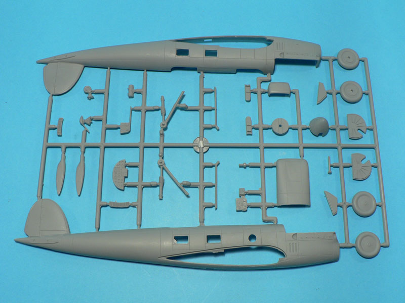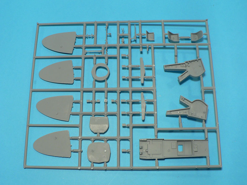 Die Plastik-Spritzlinge deuten darauf hin, dass es sich hier um ein "Short Run" Bausatz handelt. Alle Teile wird man säubern und einige der kleineren vielleicht sogar verfeinern oder ersetzen müssen. Die Gravur ist sehr unterschiedlich. Die Oberfläche der Flügel ist zum Beispiel ganz in Ordnung, aber die des Rumpfes weniger gelungen. Ich habe den Eindruck, dass mehrere Leute an dem Projekt beteiligt waren und das einige mehr oder weniger begabt waren. Es scheint so als ob die Metal- (oder Resin?) Formen ein wenig bei der Herstellung der Spritzlinge gelitten haben, denn an manchen Stellen sind die Details verschwunden. Auf der rechten Rumpfseite kann mann vorne sogar so etwas wie eine Bruchlinie erkennen. Also wie gesagt, die Teile zuerst säubern und feinschleifen bevor man sie einsetzt.