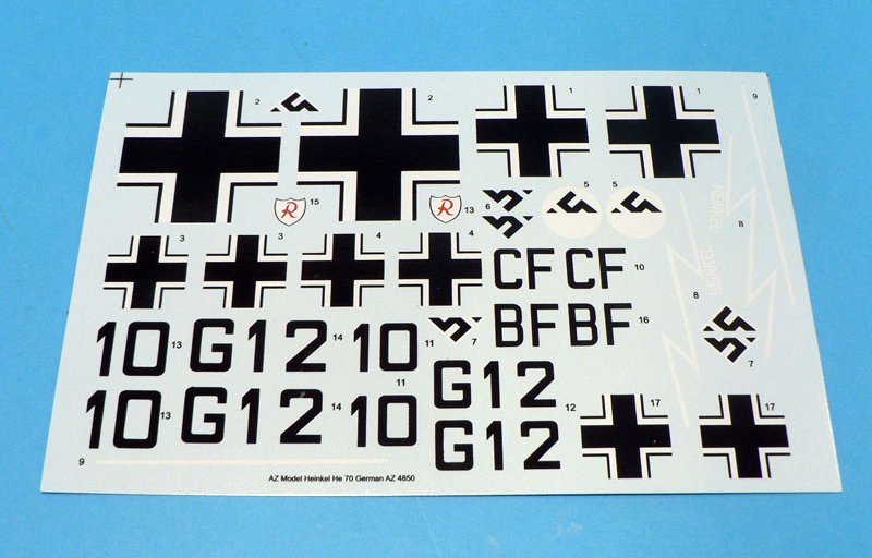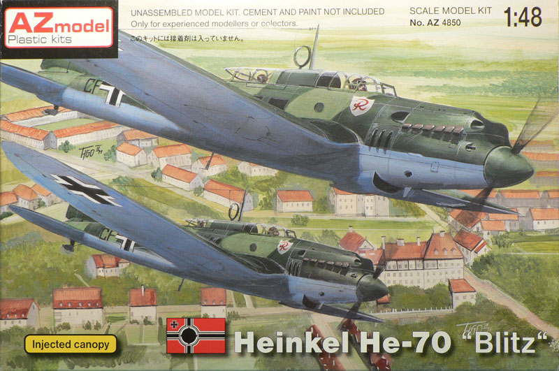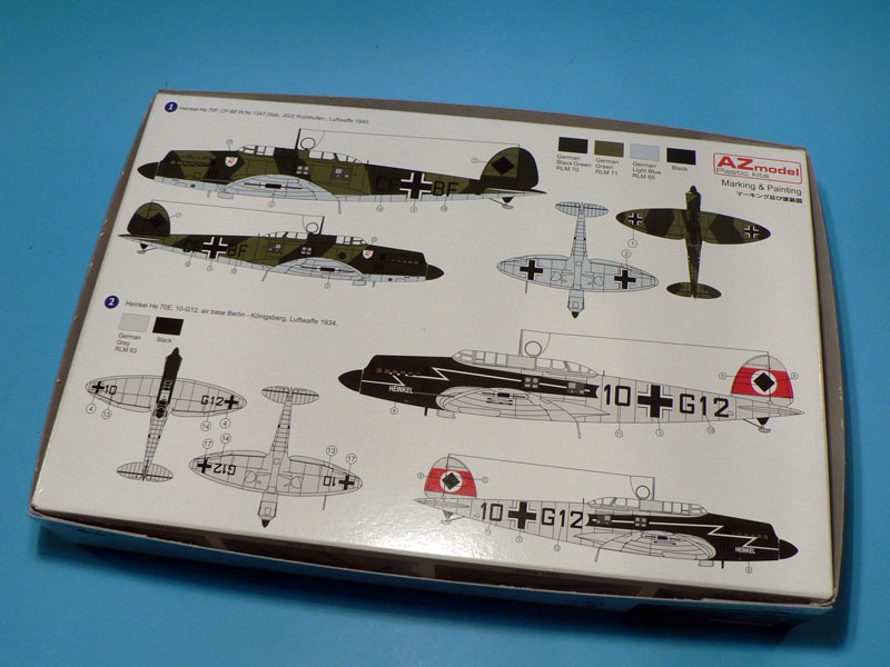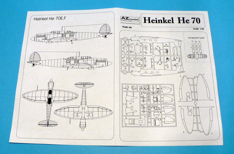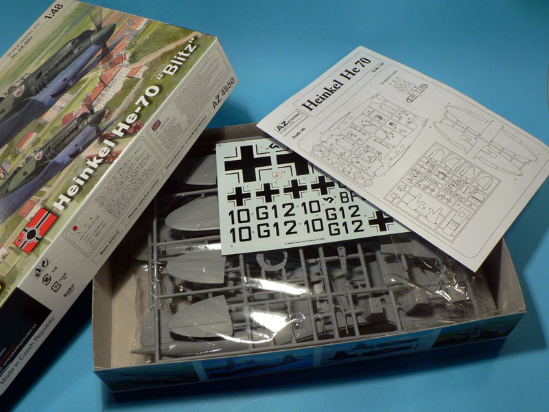 Bausatz: AZ Model liefert hier das erste Plastikbausatz der Heinkel He 70 im Maßtab 1/48. Es wurde auch Zeit denn es handelt sich hier um ein wichtiges Flugzeug der Luftfahrtgeschichte. In der Schachtel befindet sich ein Beutel mit Plastikteilen, einem Decalbogen und der Bauanweisung.