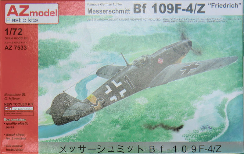 Bausatz: AZmodel von Petr Muzikant aus Prag hat seit einiger Zeit verschiedene Varianten der Messerschmitt Bf 109 im Maßstab 1/72 im Programm und kürzlich erschien die Bf 109F-4/Z. In der attraktiven aber unpraktischen Schüttbox befinden sich gut verpackt zwei hellgraue Spritzlinge mit 59 Einzelteilen, drei Klarsichteile, zwei Decalbögen und die gut gemachte mehrfarbige Bauanleitung. AZmodel liefert gut gemachte Spritzgussteile mit feinen versenkten Strukturen und Details die voll auf der Höhe der Zeit sind.