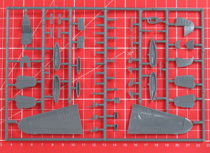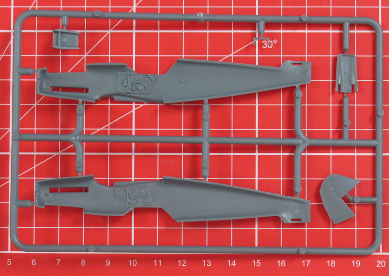 Zunächst zum Inhalt. In der attraktiven aber unpraktischen Schüttbox befinden sich sehr gut verpackt drei graue Spritzgussrahmen mit 86 Teilen, einen Klarsichtrahmen mit zwei Teilen, vier Decalbögen, eine mehrfarbige Bau- und Bemalungsanleitung. Einige Teile sind für andere Varianten bestimmt und wandern in die Restekiste. Der Bau beginnt hier mit dem Instrumentenbrett. Eigentlich soll es hier ein Decal für die Instrumente geben. Leider fehlt dieses ebenso wie die für die Sitzgurte. Dafür gibt es schön detaillierte Handräder, Seitenruderpedale, ein Visier und einen Steuerknüppel. In den Rumpfhälften hat AZ die seitlichen Konsolen gleich anmodelliert.