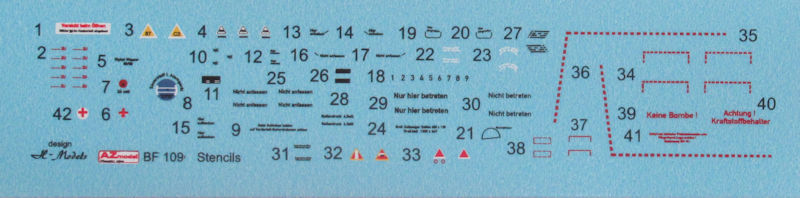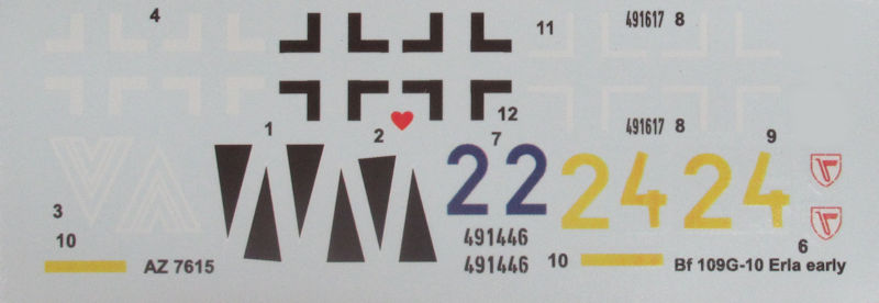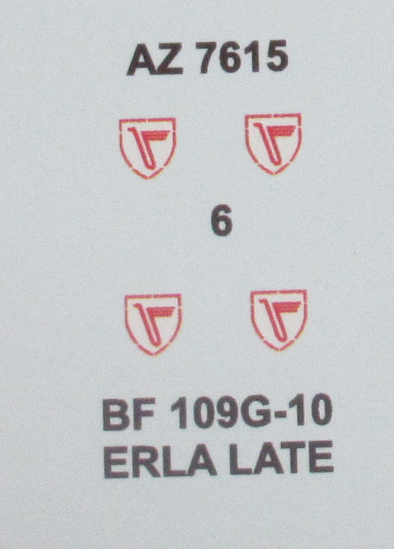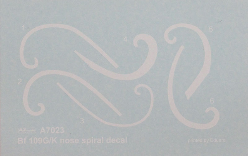 Obwohl es vier Decalbögen gibt, konnte ich die Decals für Instrumentenbrett und Sitzgurte nicht finden. Dafür gibt es Spinnerspiralen und eine Menge Wartungshinweise. Bei den Farbhinweisen bezieht sich AZmodel auf die RLM- und Humbrol-Farbtöne.