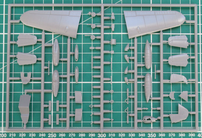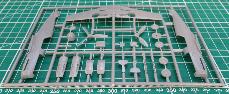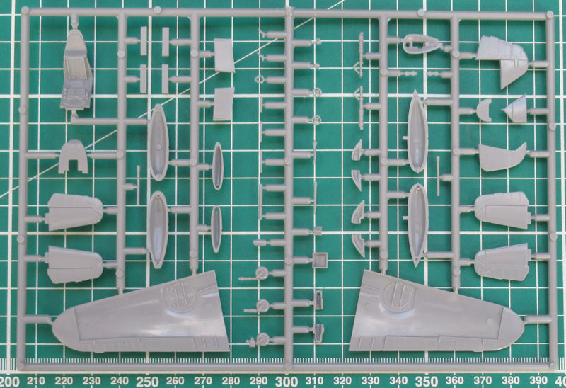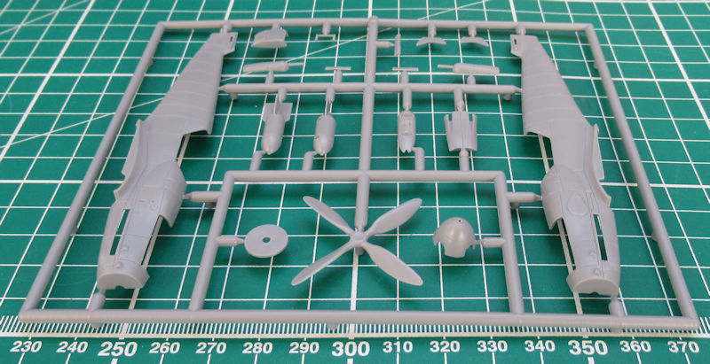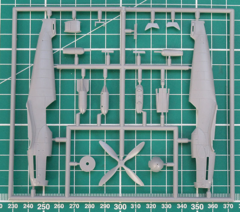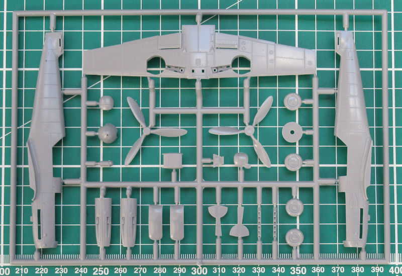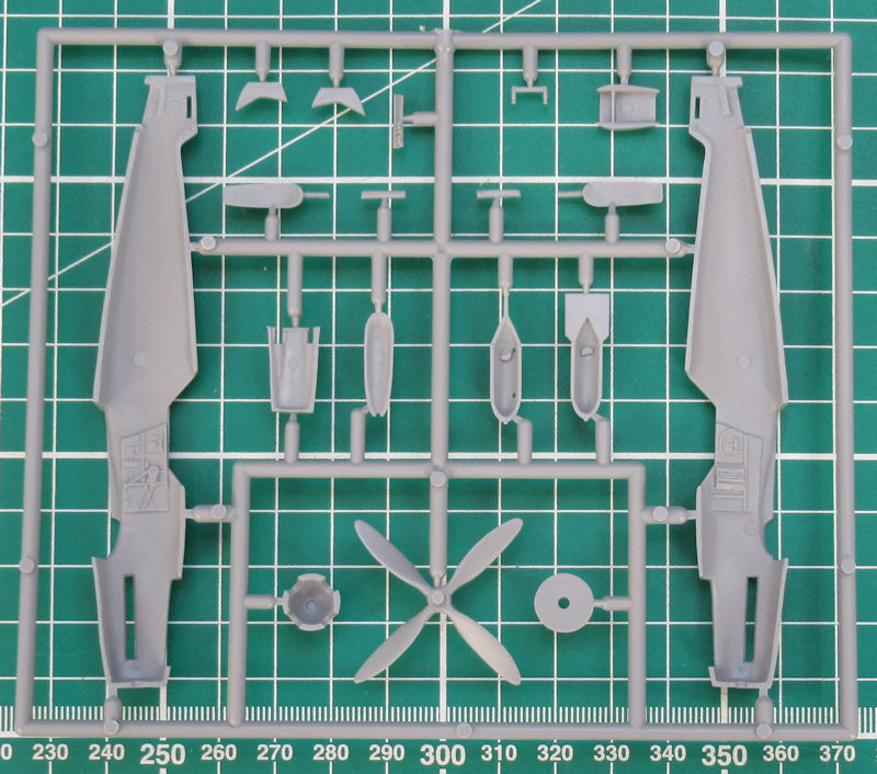 Die einteilige Luftschraube für die K-14 ist samt Propellerhaube neu. Das Luftleitblech über den linken Auspuffstutzen wird einzeln aufgeklebt. Die Krümmer selbst sollen von innen vor dem Zusammenfügen der Rumpfhälften eingeklebt werden. Diese Lösung ist nicht optimal. Die Fahrwerksschächte sind in den Tragflächen schön detailliert. Beim Zusammenbau dieser Flächen ist genau auf den Winkel zu achten. Die Bauanleitung zeigt wie es aussehen muss. Die Flächenkühler müssen angepasst werden. Die großen Beulen auf den Tragflächen hat AZmodel sehr gut wiedergegeben.