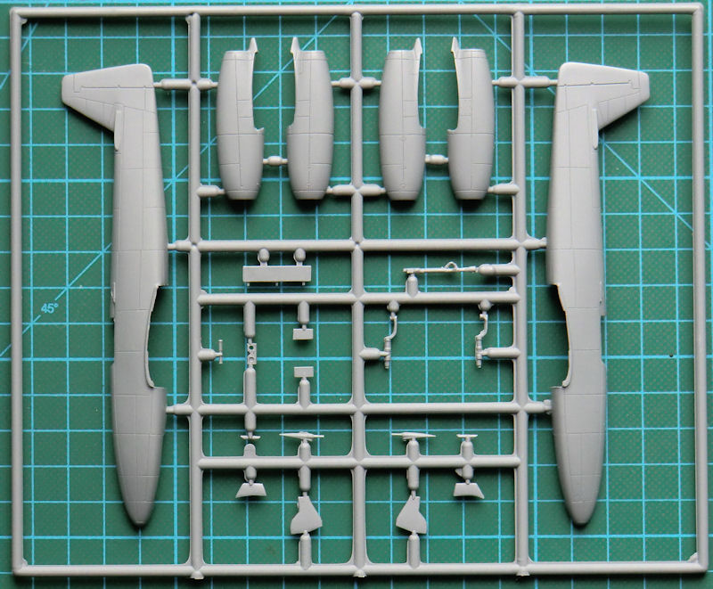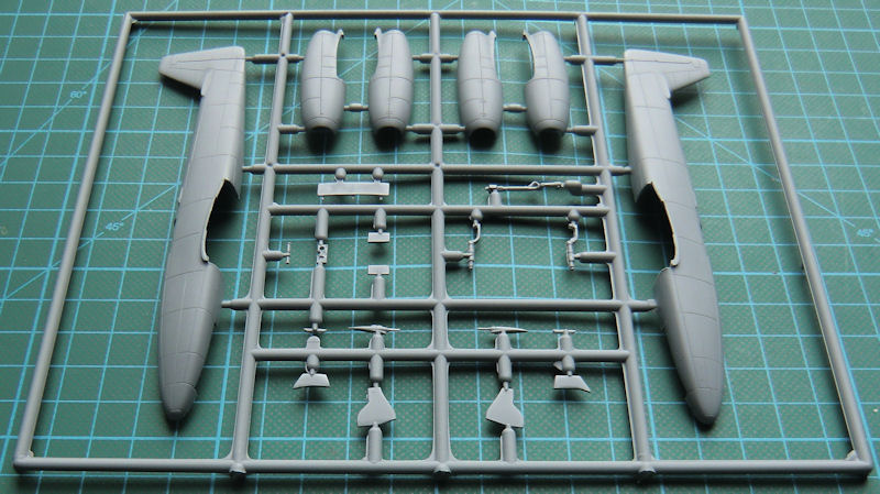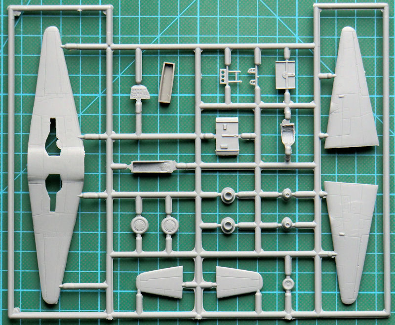 Die Bauteile sind typisch Short-Run-Technologie. Es gibt feine versenkte Strukturen mit etwas Grat. Der Bugfahrwerksschacht liegt separat bei, denn sein Original im Spritzrahmen ist total mißglückt. Das Cockpit entsteht auch acht Spritzgussteilen. Die Sitzgurte sind aufmodelliert und auch die Instrumente auf dem Instrumentenbrett. Das Höhenleitwerk besteht aus zwei Hälften mit scharfen Hinterkanten. Diese gibt es bei der Tragfläche und dem Seitenleitwerk aufgrund der konventionellen Konstruktion nicht.
